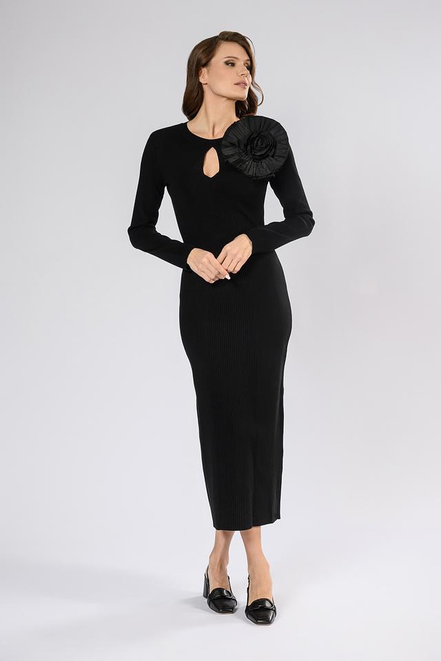 Особенностью модели является вырез в форме капли на горловине и эффектный декоративный цветок из ткани на плече. Платье выполнено из мягкого и приятного к телу трикотажа, обеспечивающего комфорт в носке.