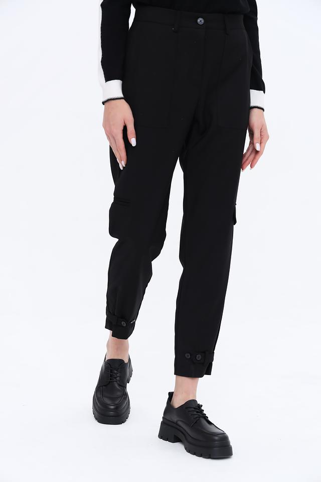 Брюки имеют удобный крой и функциональные карманы, что делает их практичными для повседневной носки. Застёжка на пуговицу и молнию обеспечивает надежную фиксацию. Манжеты внизу брюк дополнены пуговицами для регулировки длины и создания желаемого образа.
