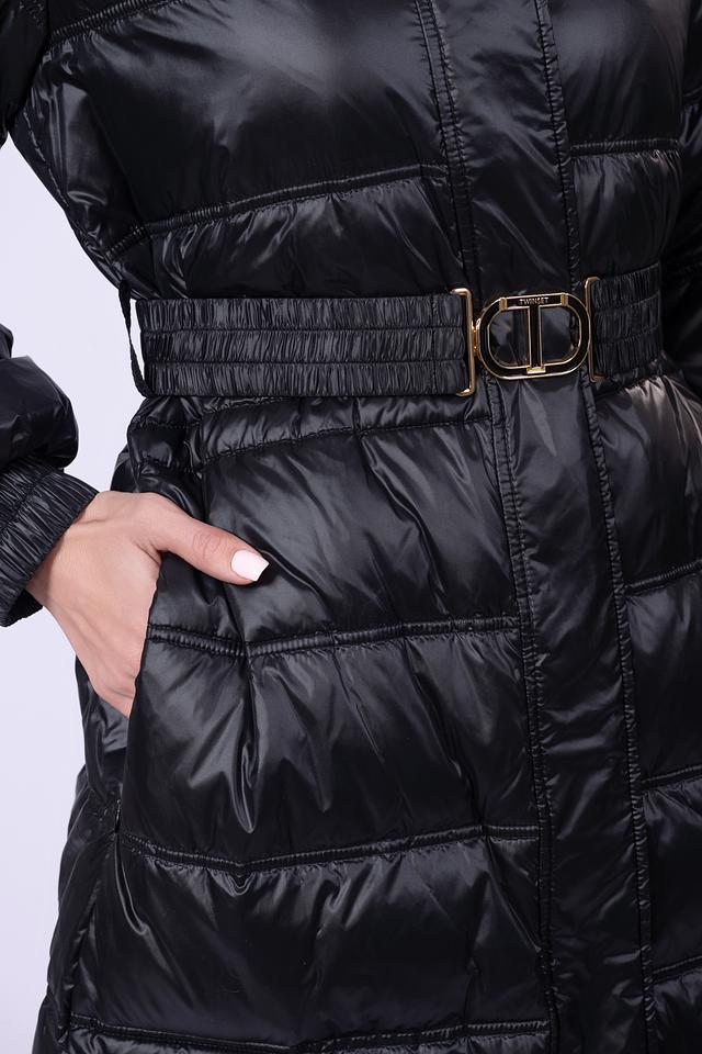 Чёрное стеганое пальто Twin Set – это стильное и теплое решение для прохладной погоды. Модель имеет капюшон, пояс и удобные манжеты на рукавах, что обеспечивает комфорт и защиту от ветра. Состав: полиамид 100%