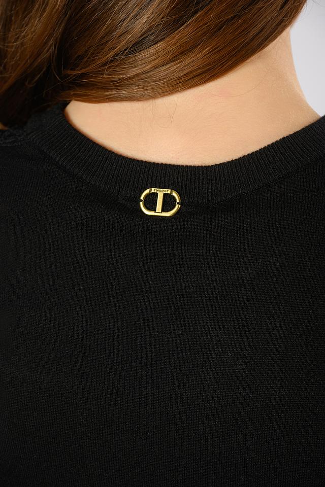 Элегантное короткое платье Twin Set черного цвета с изящной отделкой из кружева. Модель имеет длинные рукава и приталенный силуэт, подчеркивающий фигуру. Идеальный выбор для создания женственного образа. Состав: вискоза 55%, полиамид 45%