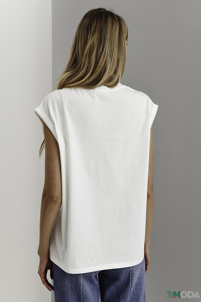 Футболка имеет свободный крой и короткие рукава с подвернутыми манжетами, что придает ей непринужденный вид. Она идеально сочетается с джинсами, шортами или юбками, позволяя создавать разнообразные образы.