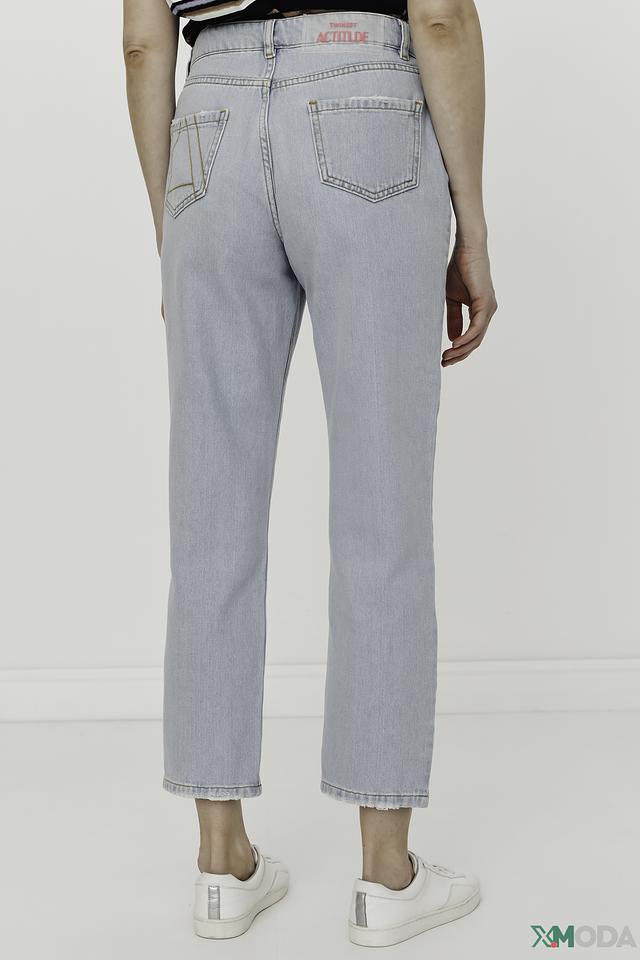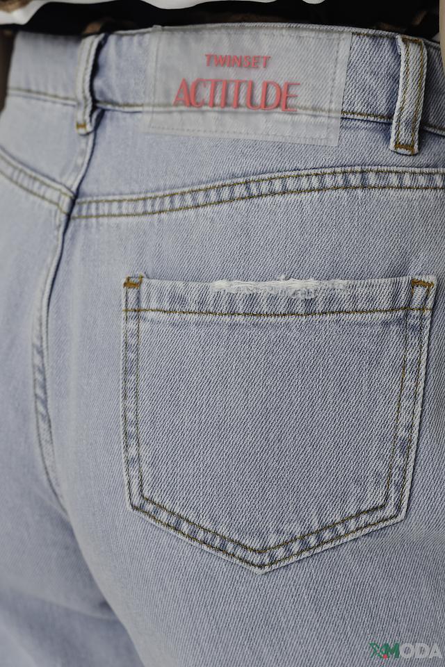 На заднем кармане джинс присутствует декоративная вышивка с названием бренда Twin Set, что добавляет им индивидуальности и узнаваемости.