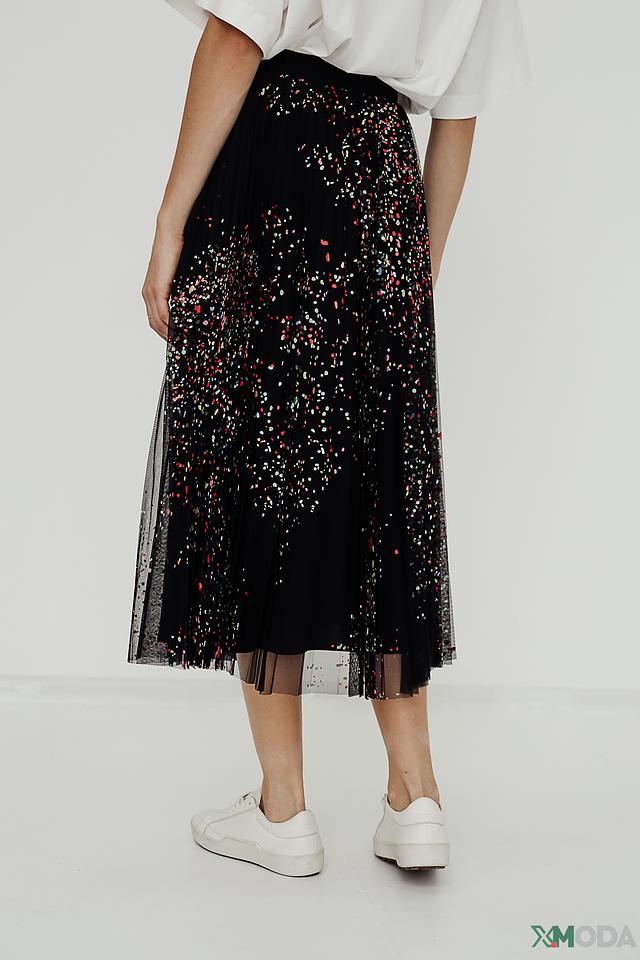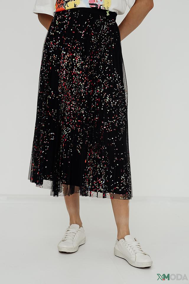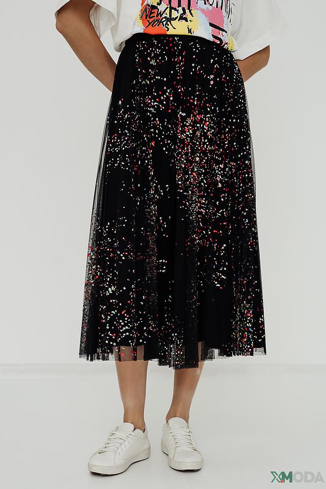 Юбка имеет длину миди и свободный крой, обеспечивающий комфорт при носке. Подкладка из полупрозрачной сетки добавляет легкости и воздушности. Модель идеально сочетается с однотонными топами и блузками, а также с обувью на каблуке или плоской подошве.