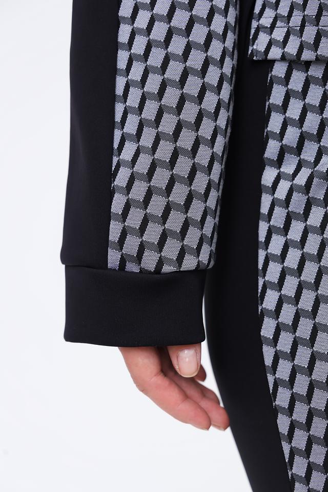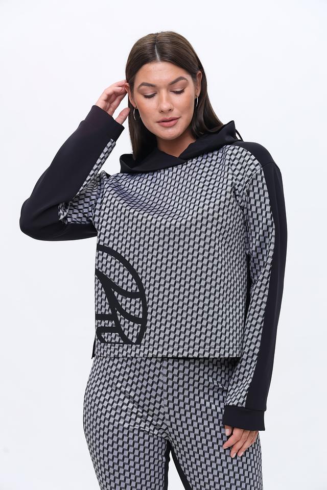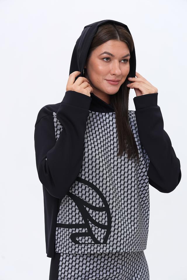 Женский пуловер Ulli Ehrlich Sportalm чёрного цвета с оригинальным геометрическим принтом и капюшоном. Модель выполнена из мягкого и эластичного материала, обеспечивающего комфорт и свободу движений. Состав: полиамид 86%, эластан 14%