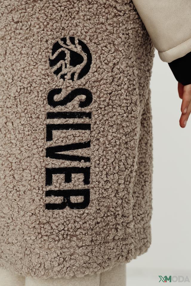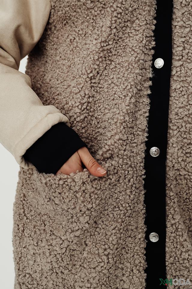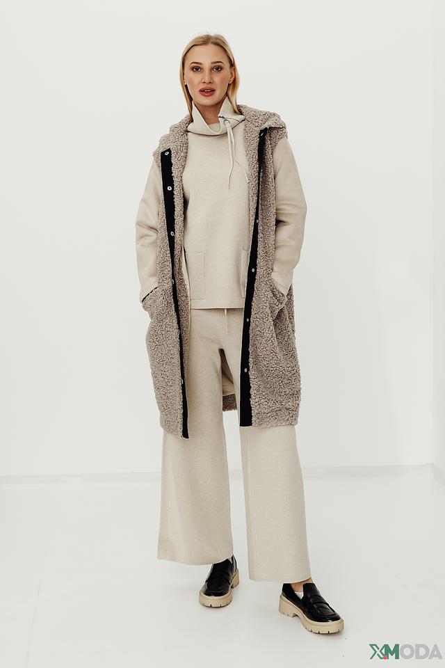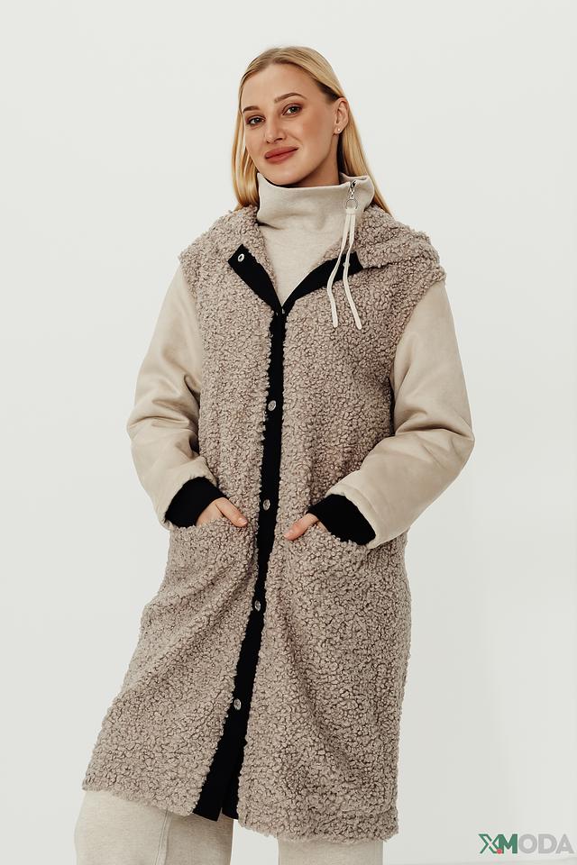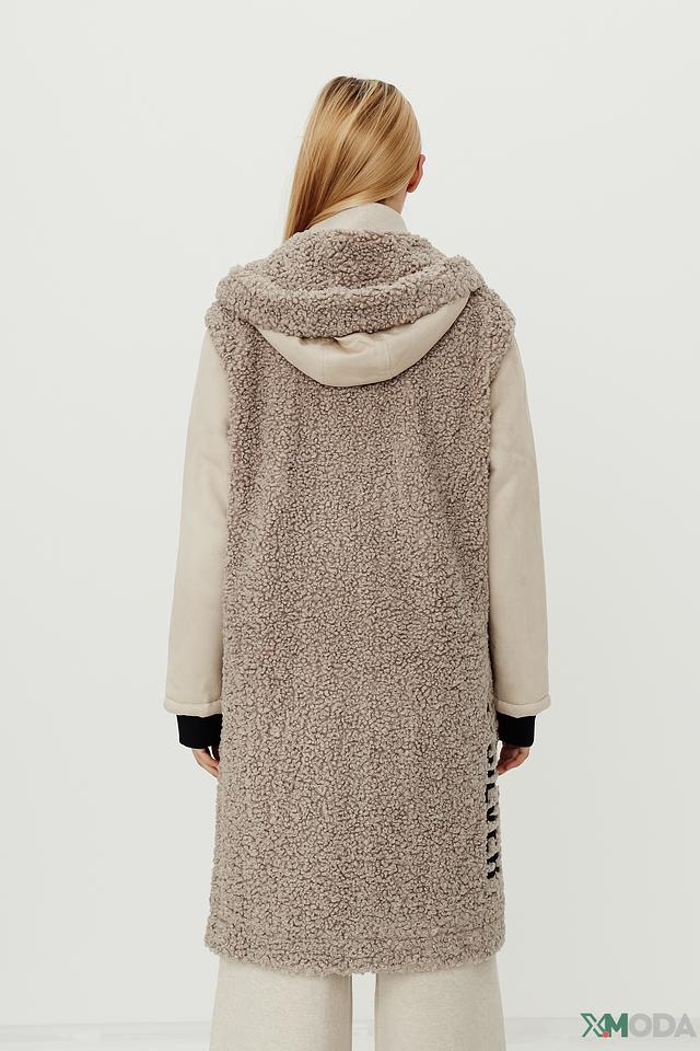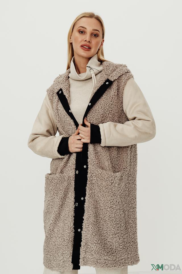 Верхняя часть изделия, включая капюшон, выполнена из мягкого, фактурного материала, напоминающего шерсть. Черная вставка по переду и бокам выполнена из гладкой ткани и застегивается на ряд пуговиц. Такой контрастный дизайн делает пальто-жилет универсальным элементом гардероба, который легко сочетается с различными стилями одежды.