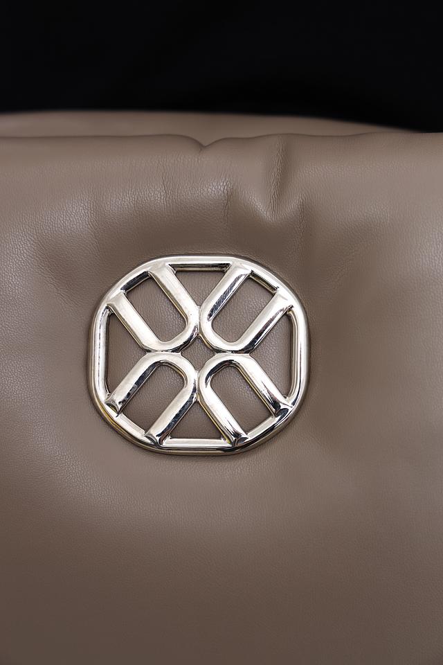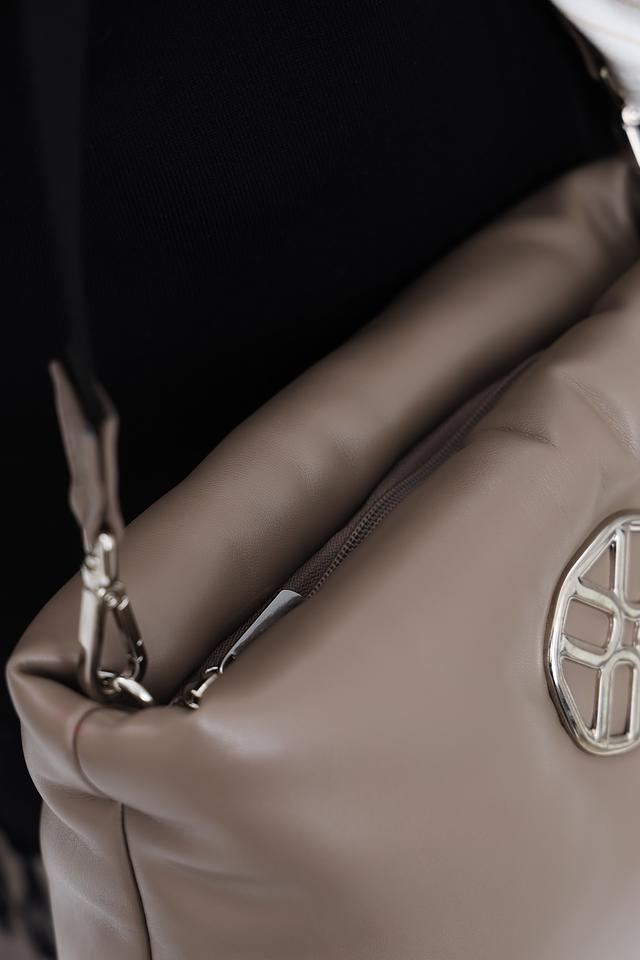 Сумка имеет бежевый цвет, который легко сочетается с различными нарядами. Декоративный металлический логотип придает ей изысканность и узнаваемость. Регулируемый плечевой ремень позволяет носить сумку комфортно на плече или через плечо.