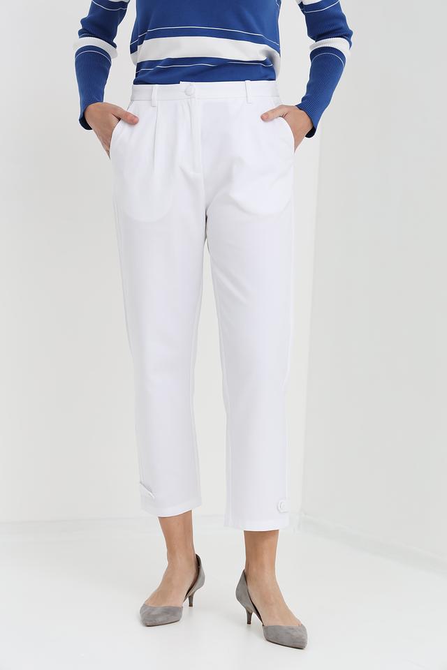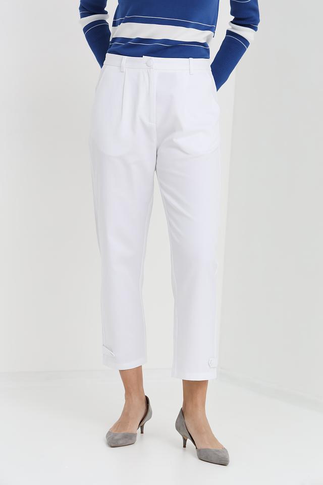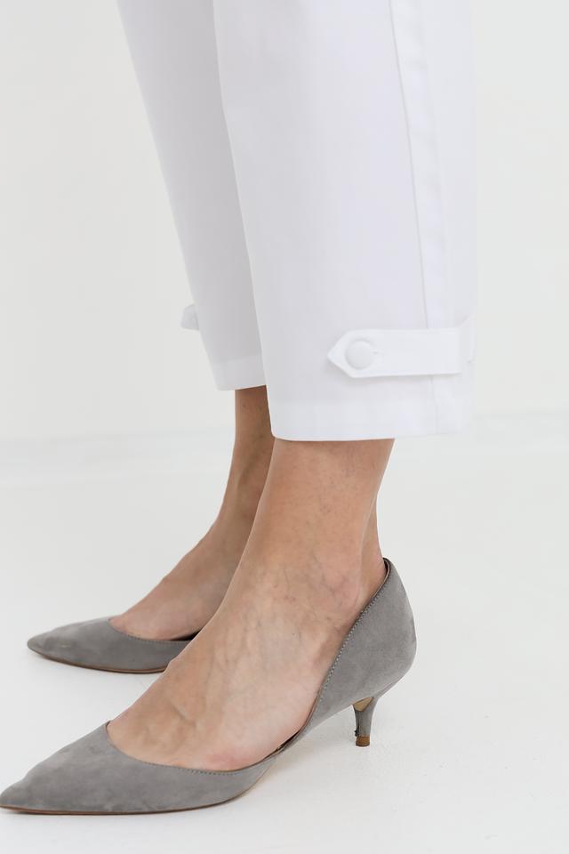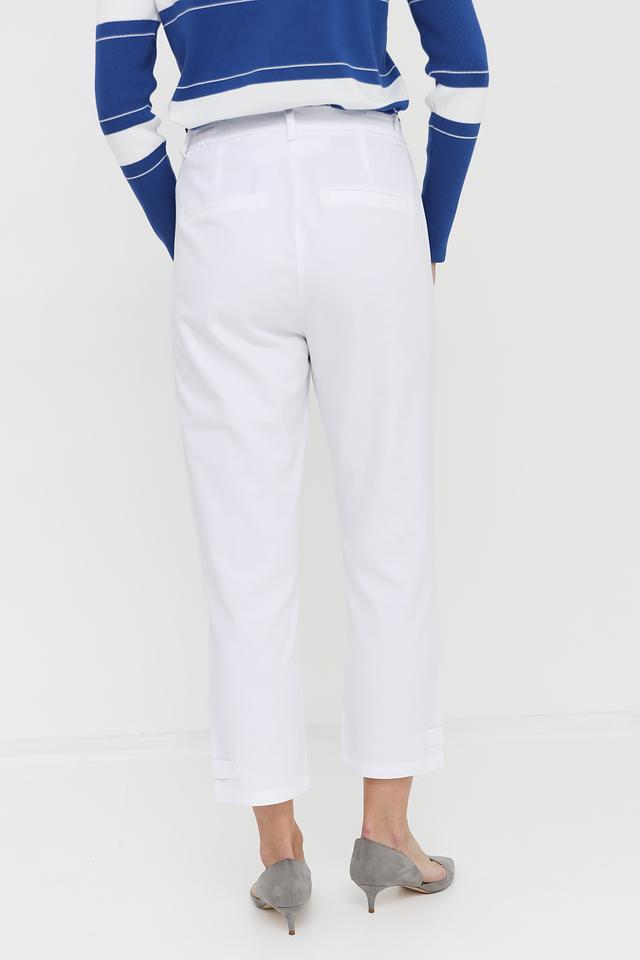 Брюки имеют укороченный крой, что делает их идеальными для ношения с туфлями-лодочками или балетками. Небольшой отворот на штанинах добавляет образу непринужденности.