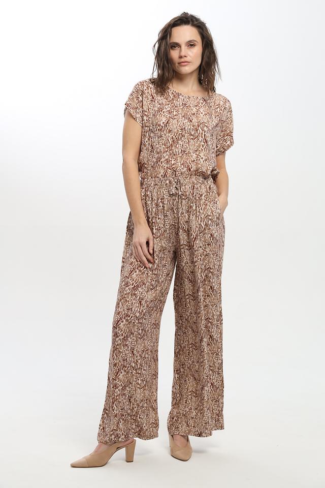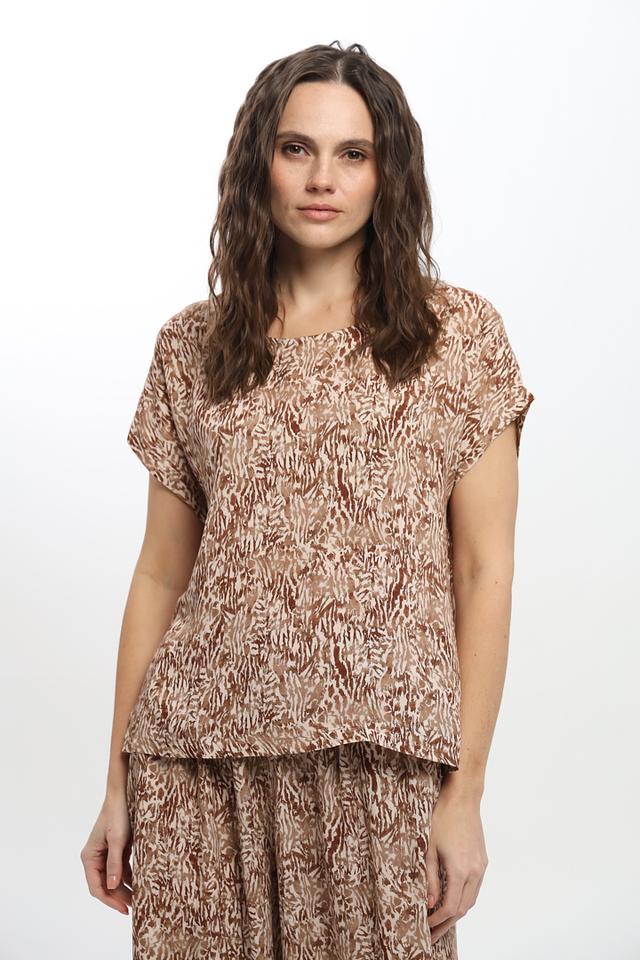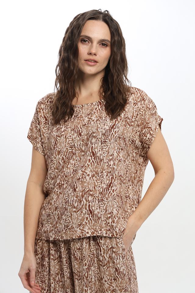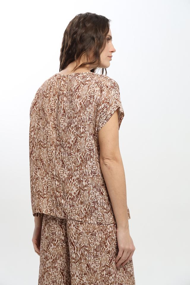 Особенностью этой модели является оригинальный принт в коричневых тонах, который добавляет образу индивидуальности и стиля. Блузу можно сочетать с брюками, юбками или джинсами, создавая разнообразные образы.
