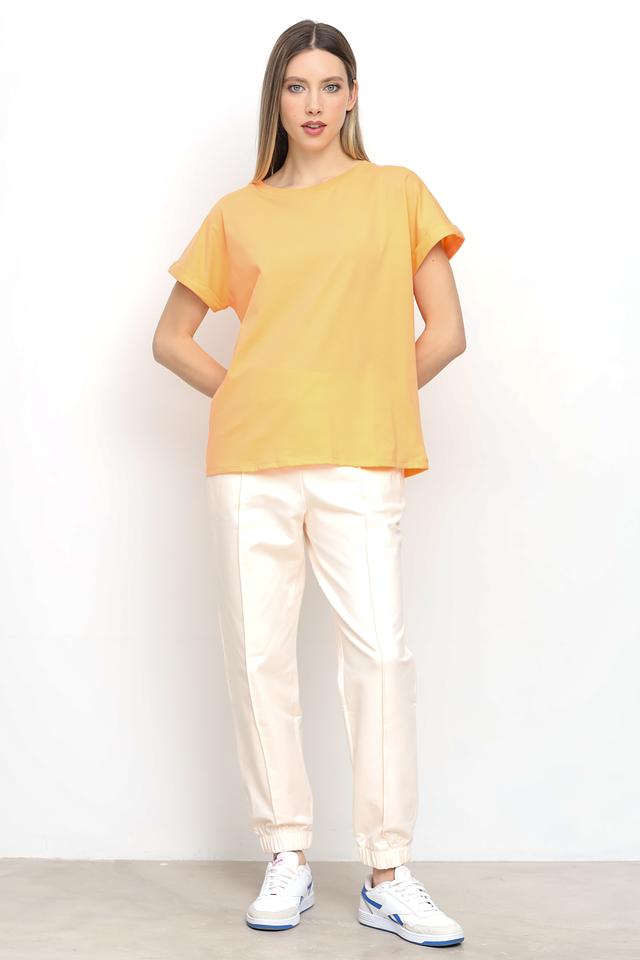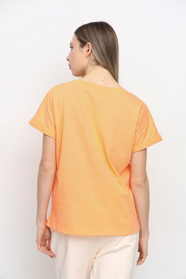 Футболка имеет прямой, слегка свободный крой, который не сковывает движений. Короткие рукава и классический круглый вырез горловины делают ее идеальной для теплой погоды. Персиковый оттенок добавит образу свежести и легкости.