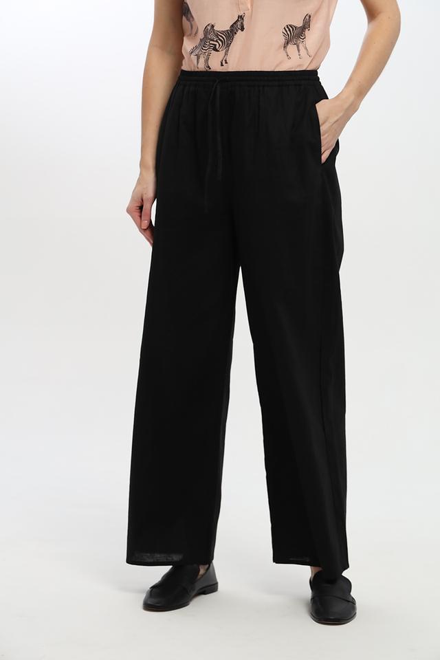 Чёрные брюки от UNQ широкого кроя — это стильное и комфортное решение для создания повседневных образов. Модель выполнена из льна и хлопка, имеет эластичный пояс и свободный силуэт. Состав: лен 55%, хлопок 45%