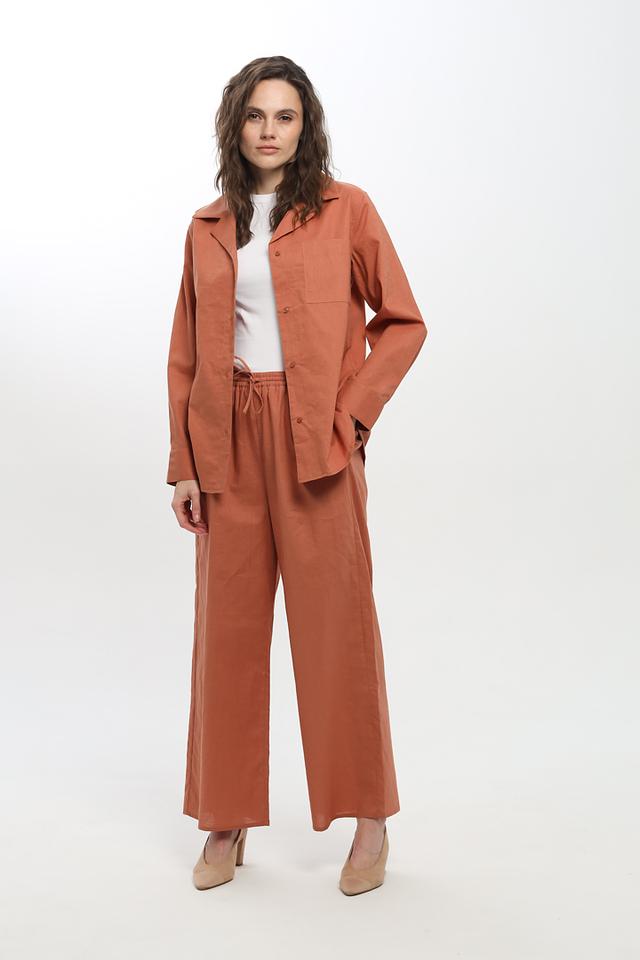 Женские брюки UNQ цвета терракоты – это стильное и комфортное решение для создания повседневных образов. Модель палаццо с эластичным поясом и завязками обеспечит свободу движений и удобную посадку. Состав: лен 55%, хлопок 45%