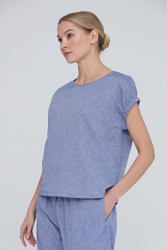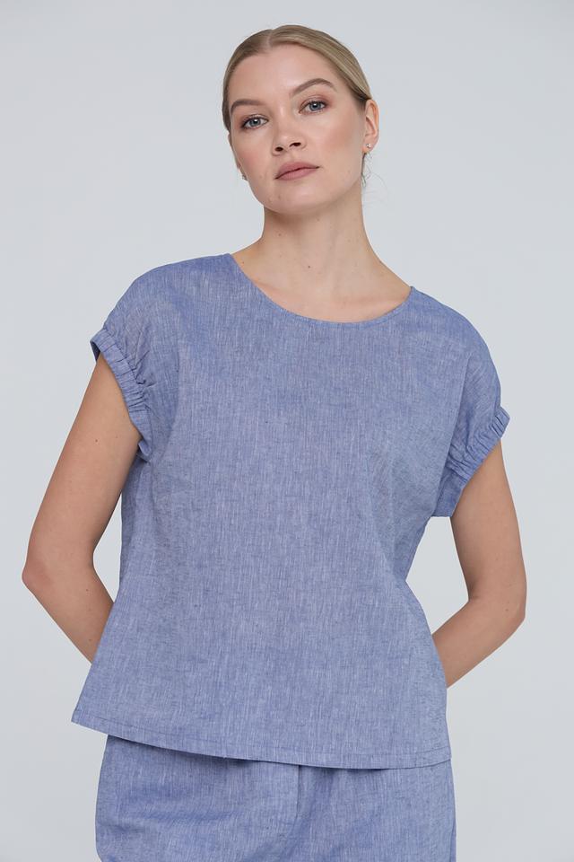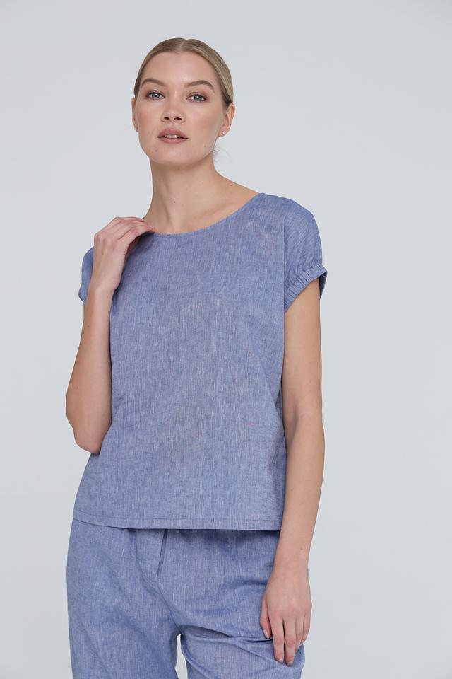 Женская блуза UNQ голубого цвета выполнена из натурального льна с хлопком. Модель имеет свободный крой, короткий рукав с небольшими складками и округлый вырез горловины. Состав: лен 55%, хлопок 45%