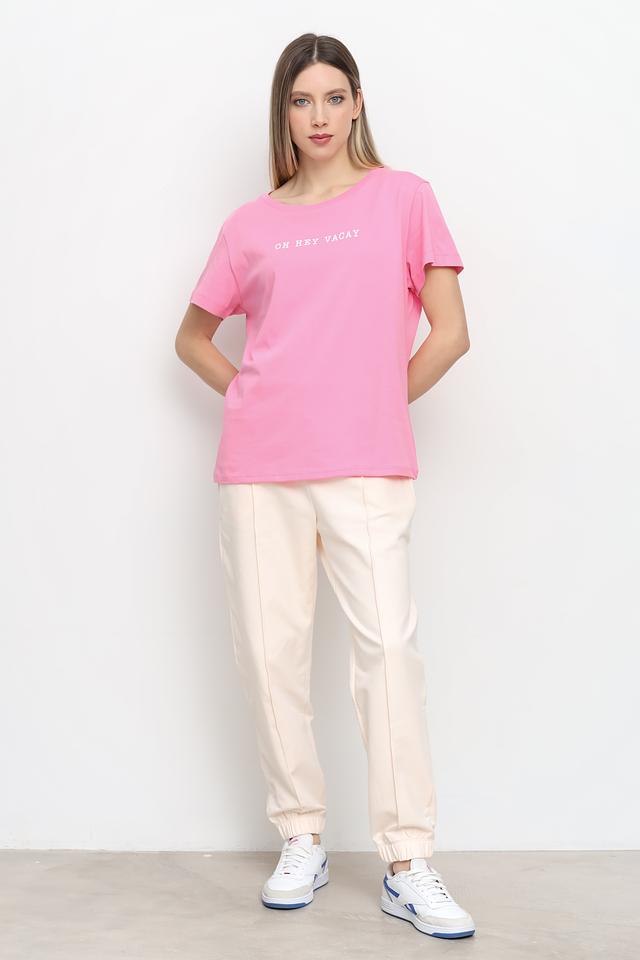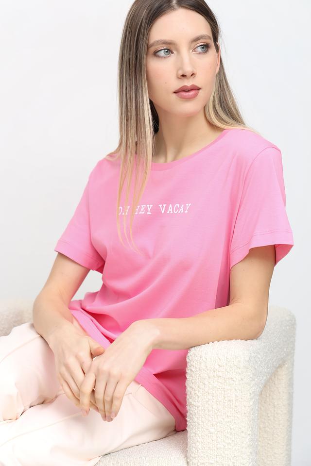 Розовая футболка от UNQ с надписью "OH HEY VACAY" станет отличным дополнением к вашему летнему гардеробу. Изготовлена из мягкого хлопка, обеспечивающего комфорт в течение всего дня. Состав: хлопок 100%