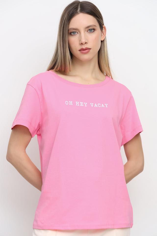 Эта стильная футболка от UNQ выполнена в ярком розовом цвете и украшена белой надписью "OH HEY VACAY". Она станет прекрасным выбором для создания непринужденного и модного образа.