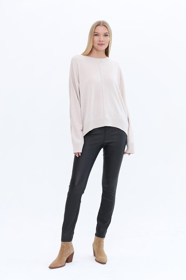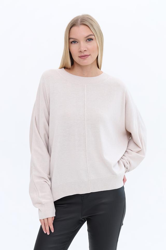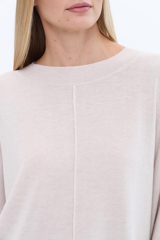 Пуловер имеет свободный крой оверсайз, который обеспечивает свободу движений и позволяет создавать расслабленные, но стильные образы. Вырез горловины – округлый, классический. По центру переда проходит вертикальная вставка, добавляющая изделию визуальную структуру.