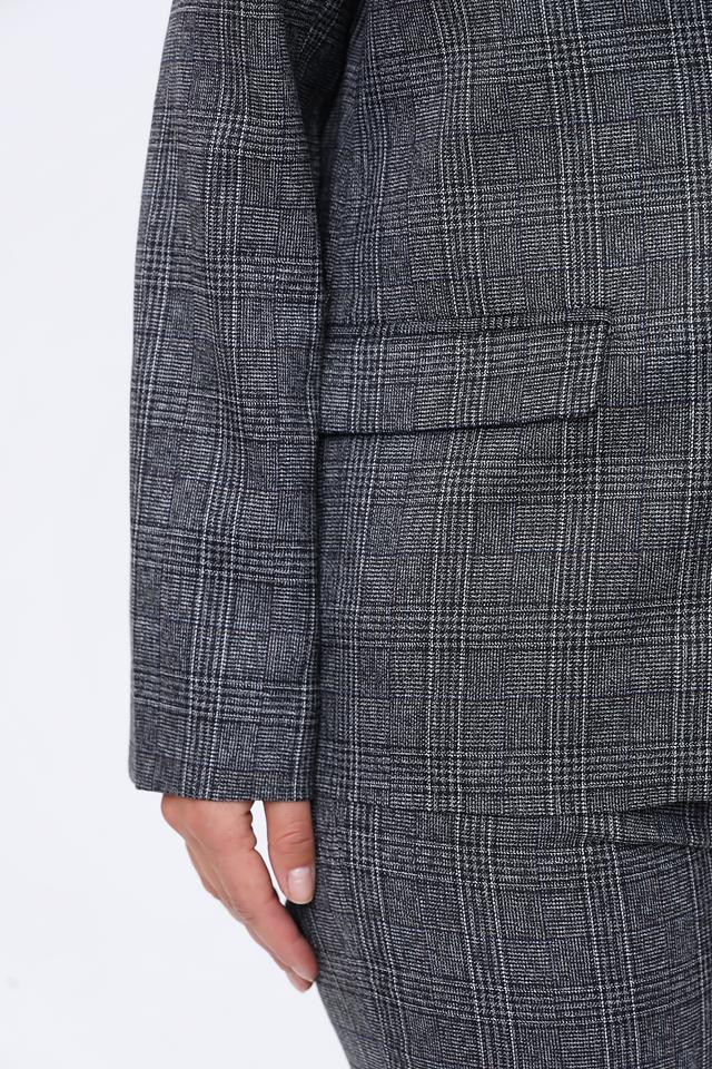 Этот жакет от UNQ станет незаменимой частью вашего гардероба. Выполненный в серой клетке, он легко сочетается с различными предметами одежды, позволяя создавать разнообразные стильные образы.