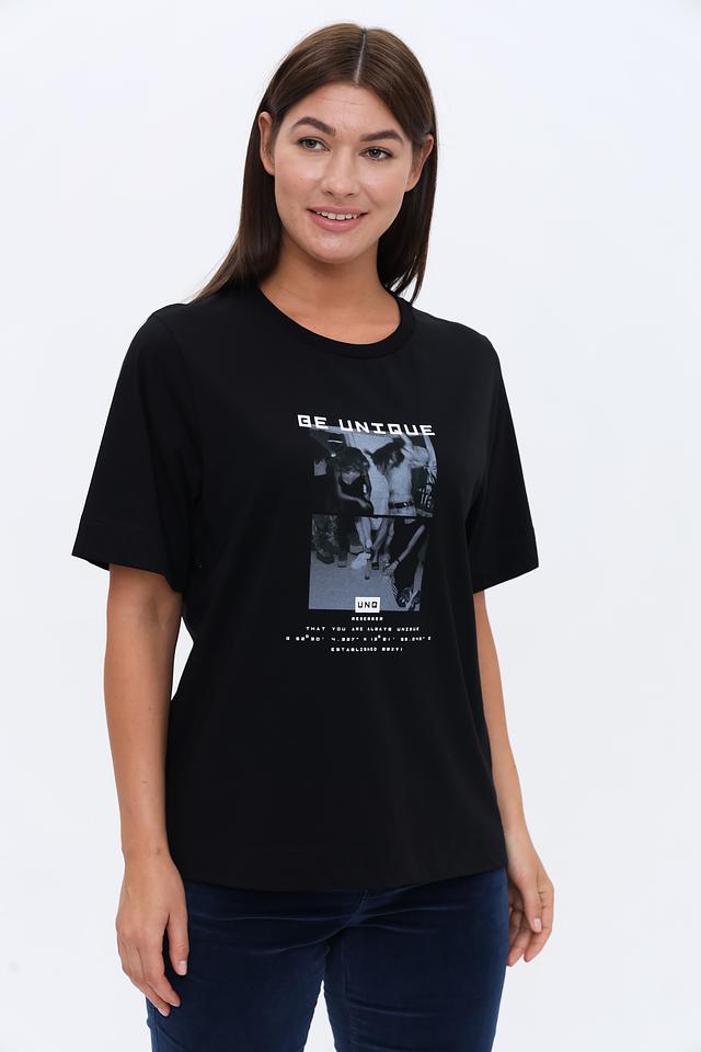 Чёрная футболка UNQ женского кроя с оригинальным принтом на лицевой стороне. Изготовлена из 100% хлопка, обеспечивающего комфорт и воздухопроницаемость. Стильный и универсальный вариант для повседневного образа. Состав: хлопок 100%