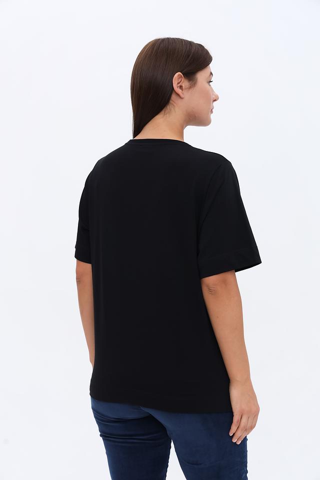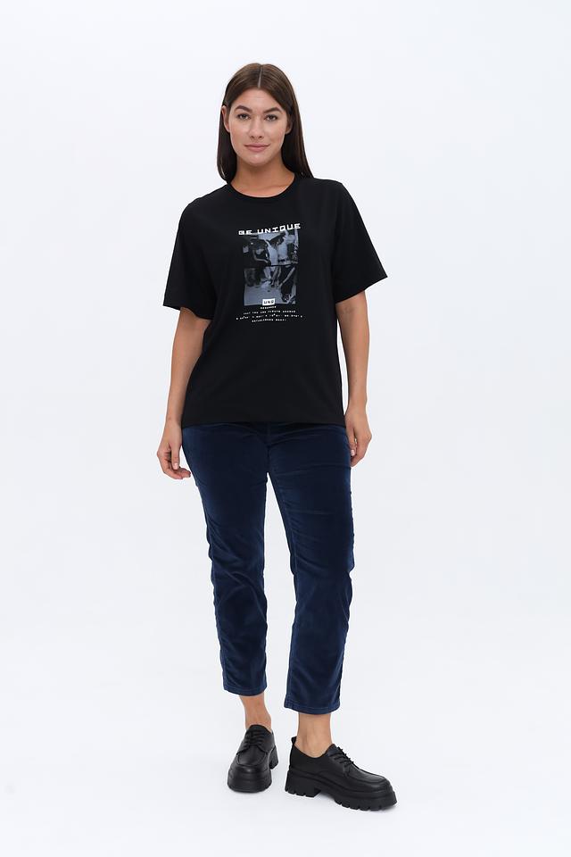 Чёрный цвет футболки универсален и легко сочетается с различными элементами гардероба. На лицевой стороне расположен яркий принт, который добавляет образу индивидуальности и выразительности.