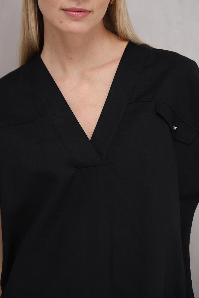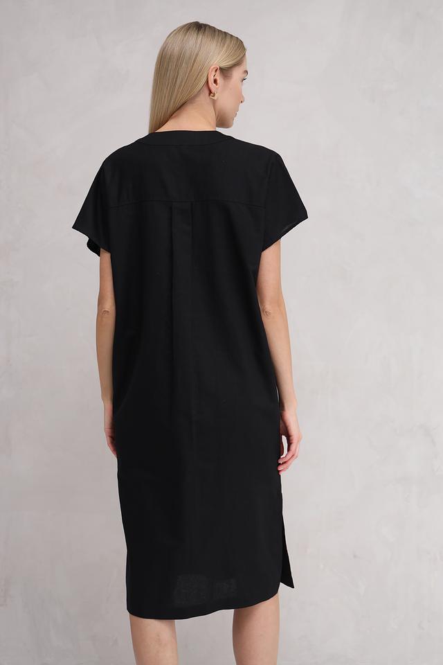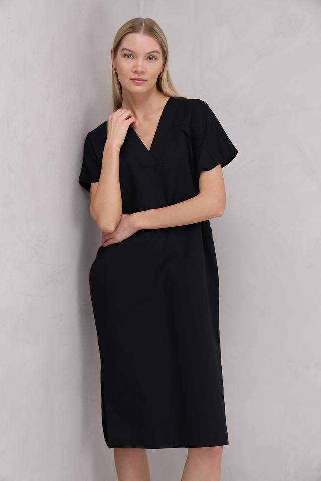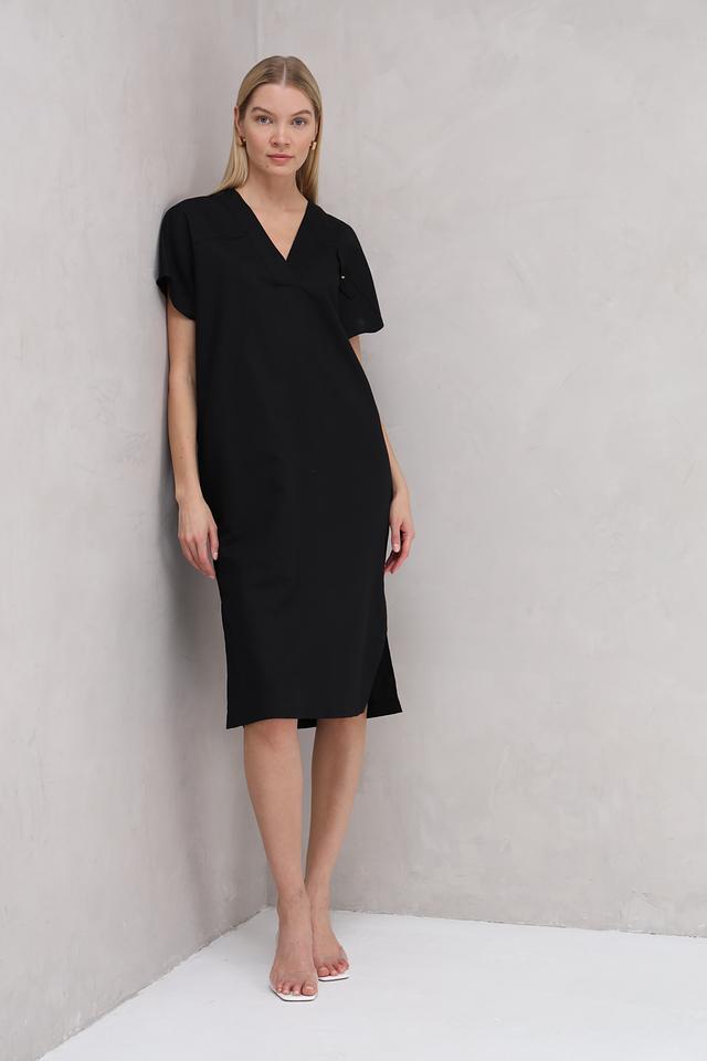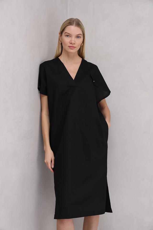 Чёрное платье от UNQ — это стильное и комфортное решение для повседневного гардероба. Платье выполнено из натурального смесового материала, имеет прямой силуэт и удобный V-образный вырез. Состав: лен 60%, хлопок 40%