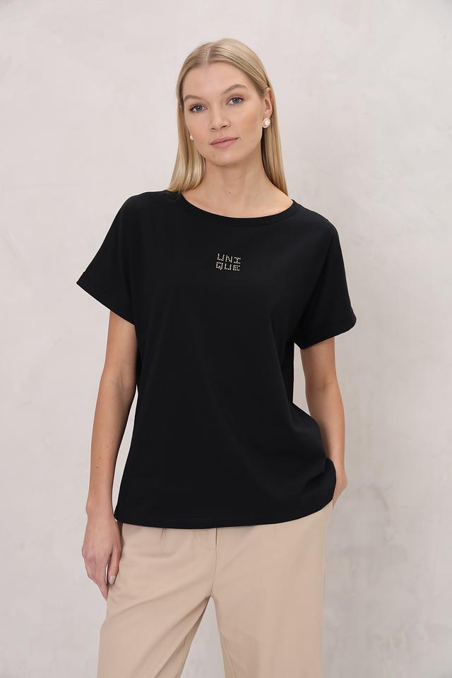 Чёрная футболка UNQ из 100% хлопка с небольшим логотипом на груди. Минималистичный дизайн и свободный крой делают эту футболку универсальным элементом гардероба. Состав: хлопок 100%