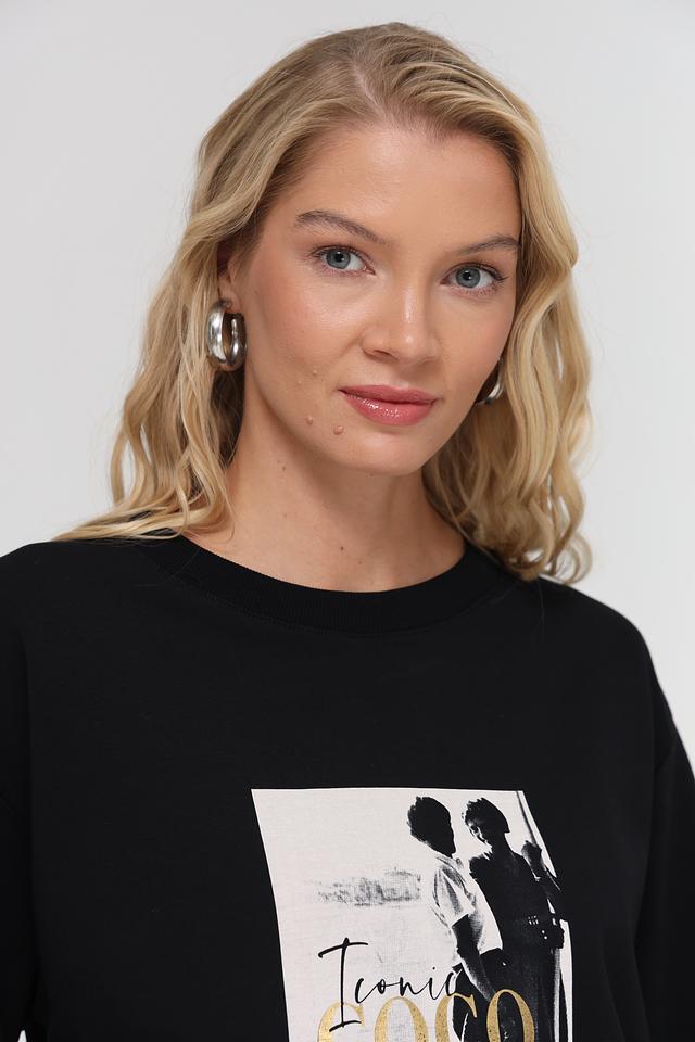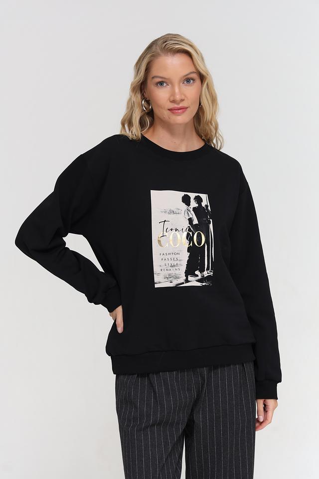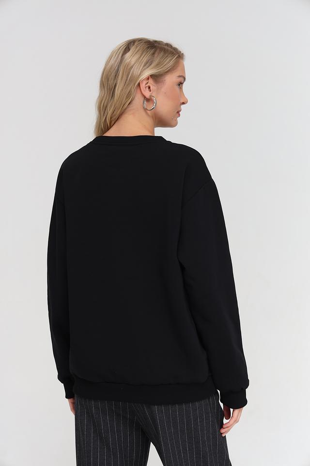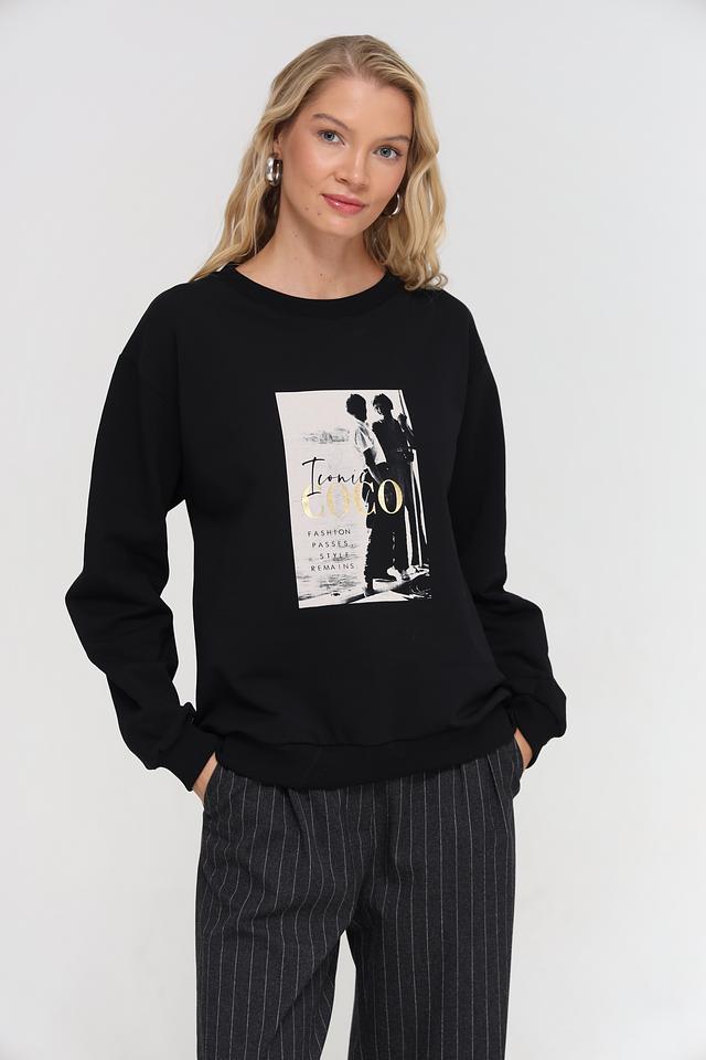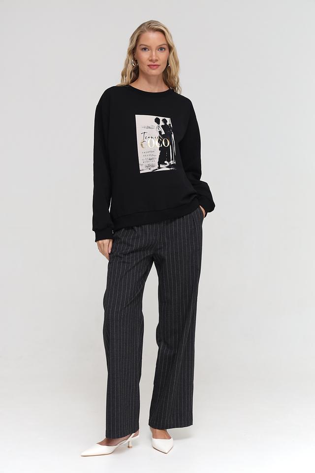 Чёрный пуловер от UNQ с оригинальным принтом. Модель выполнена из мягкого хлопка с добавлением эластана для комфорта и сохранения формы. Идеальный выбор для создания стильного повседневного образа. Состав: хлопок 95%, эластан 5%