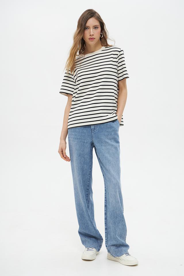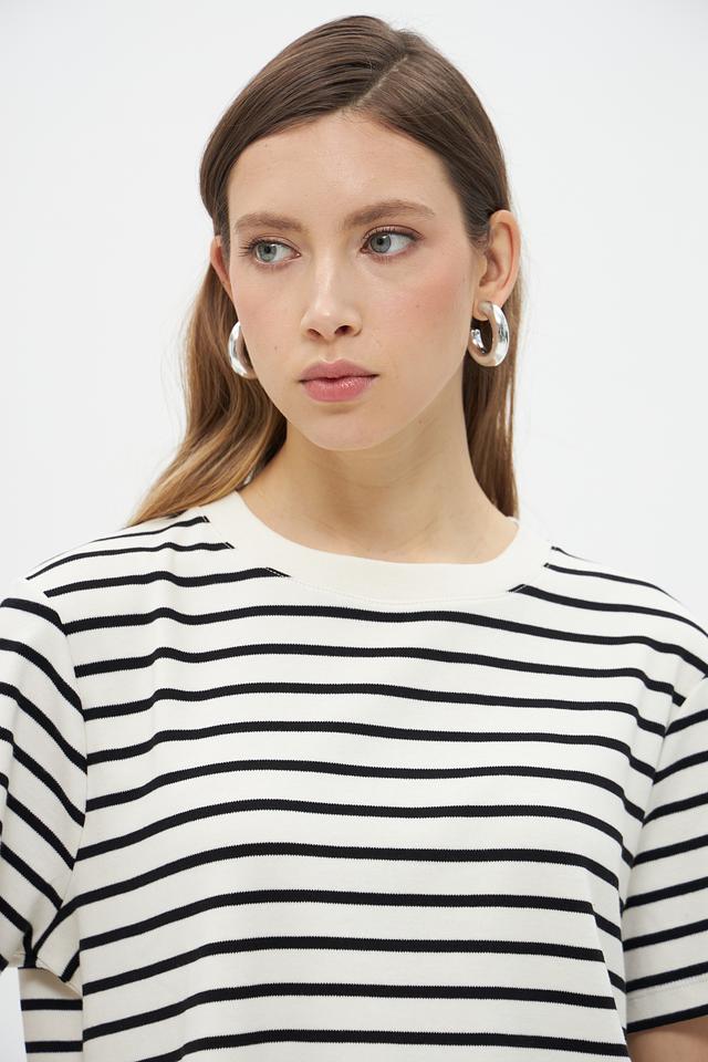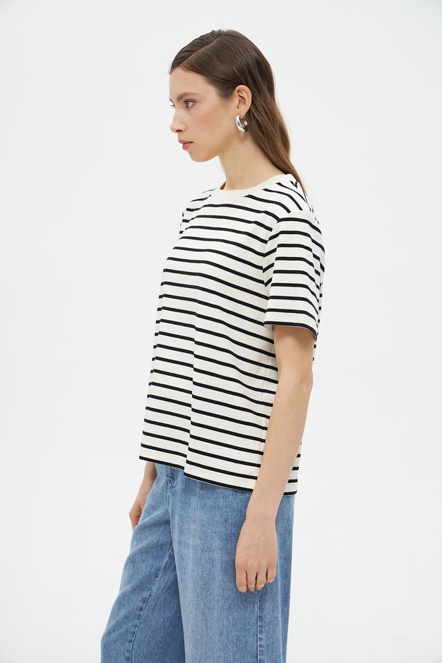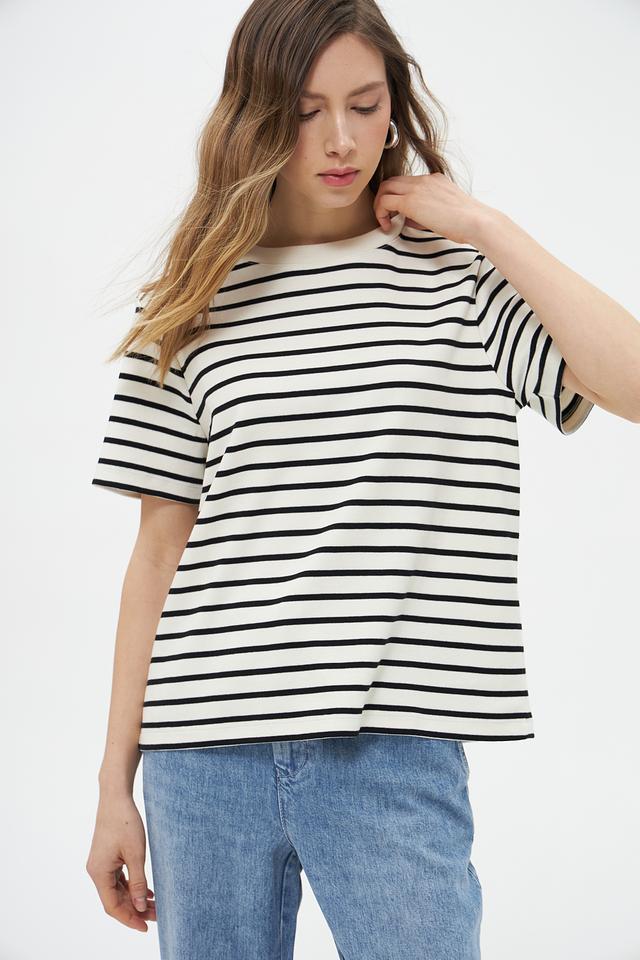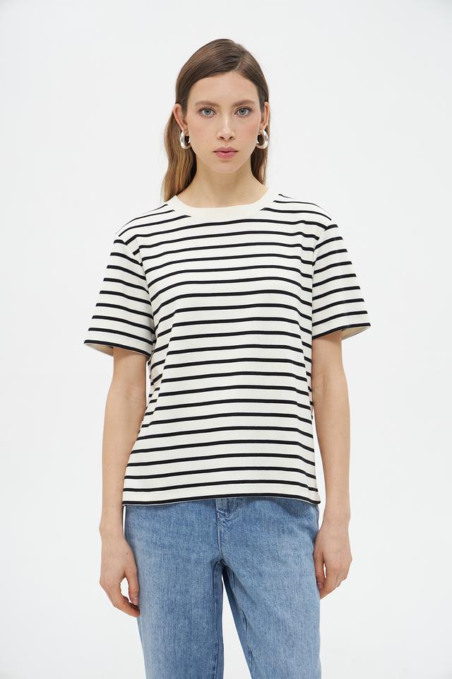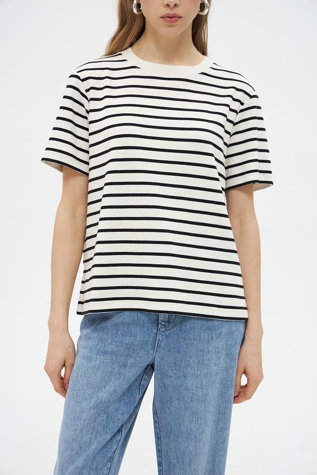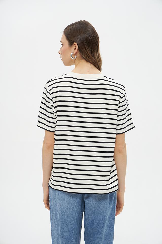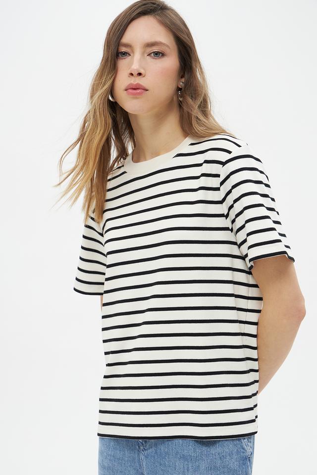 Женская футболка UNQ черного и белого цвета в классическую полоску. Изготовлена из 100% хлопка, обеспечивающего комфорт и воздухопроницаемость. Базовая модель на каждый день. Состав: хлопок 100%