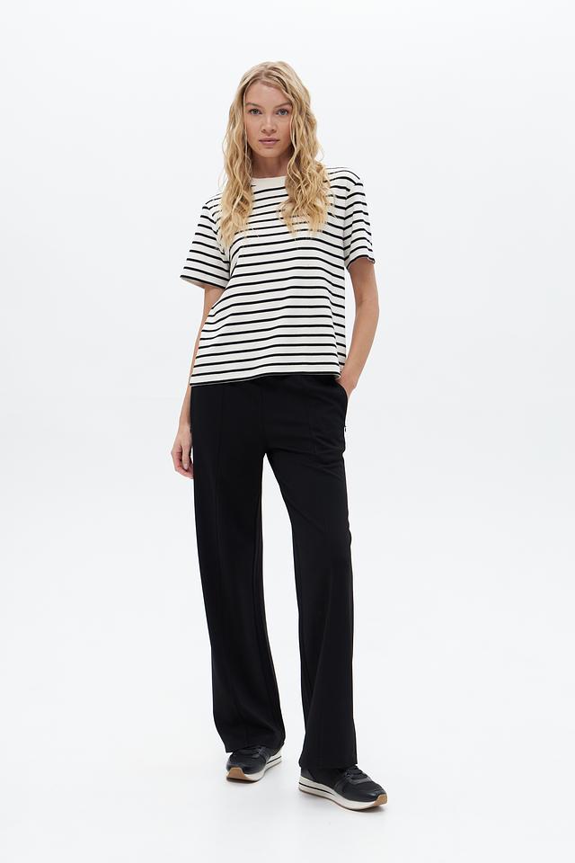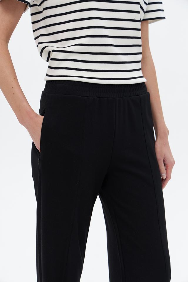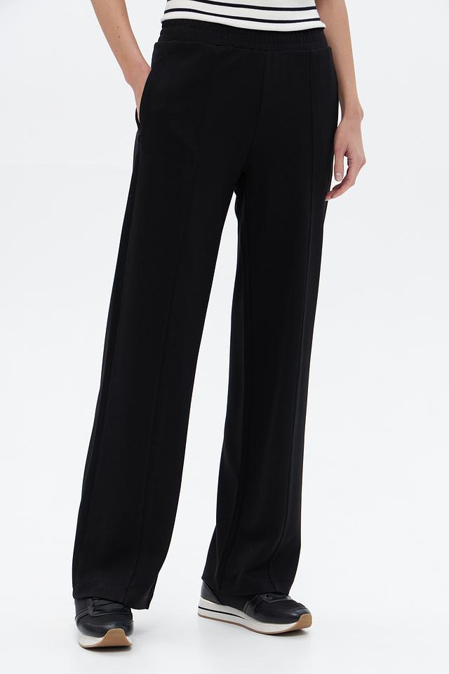 Брюки имеют прямой крой, который визуально удлиняет силуэт, а эластичный пояс обеспечивает удобную посадку. Боковые карманы добавляют функциональности и практичности. Изготовлены из мягкой и приятной к телу ткани, состоящей из вискозы, полиамида и эластана.