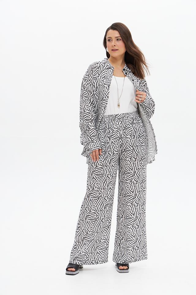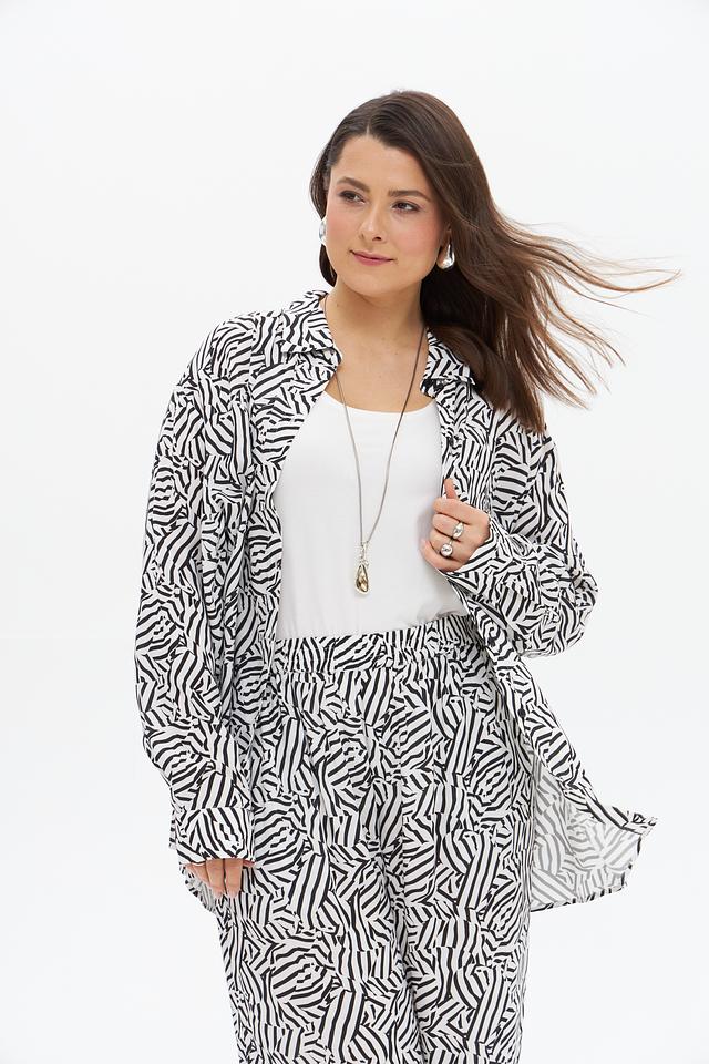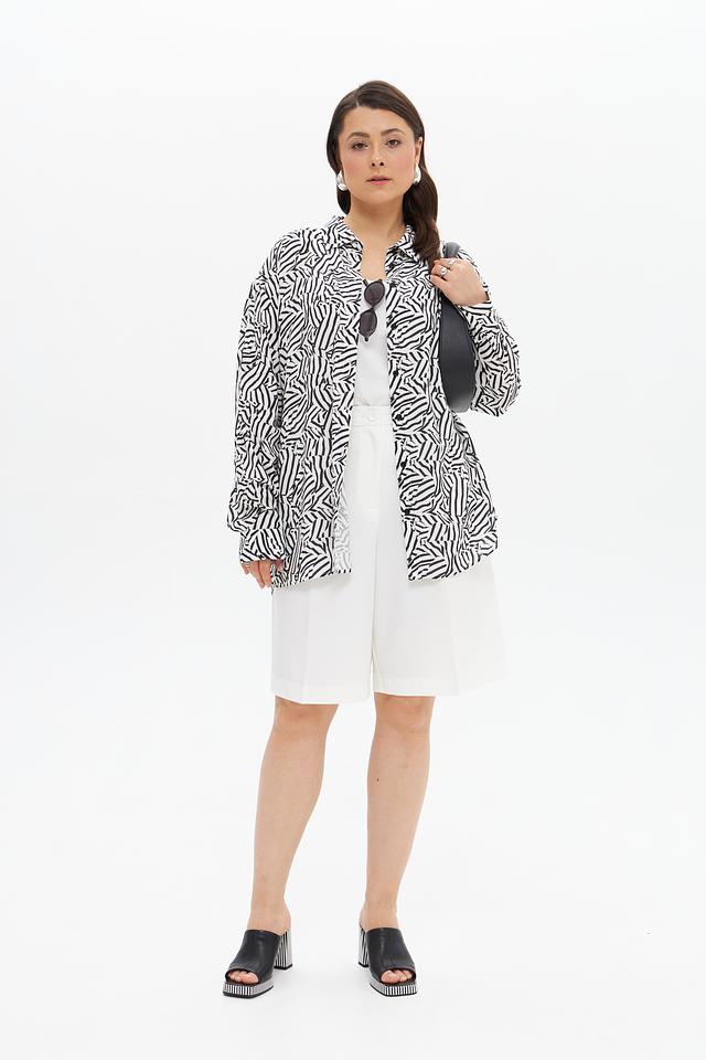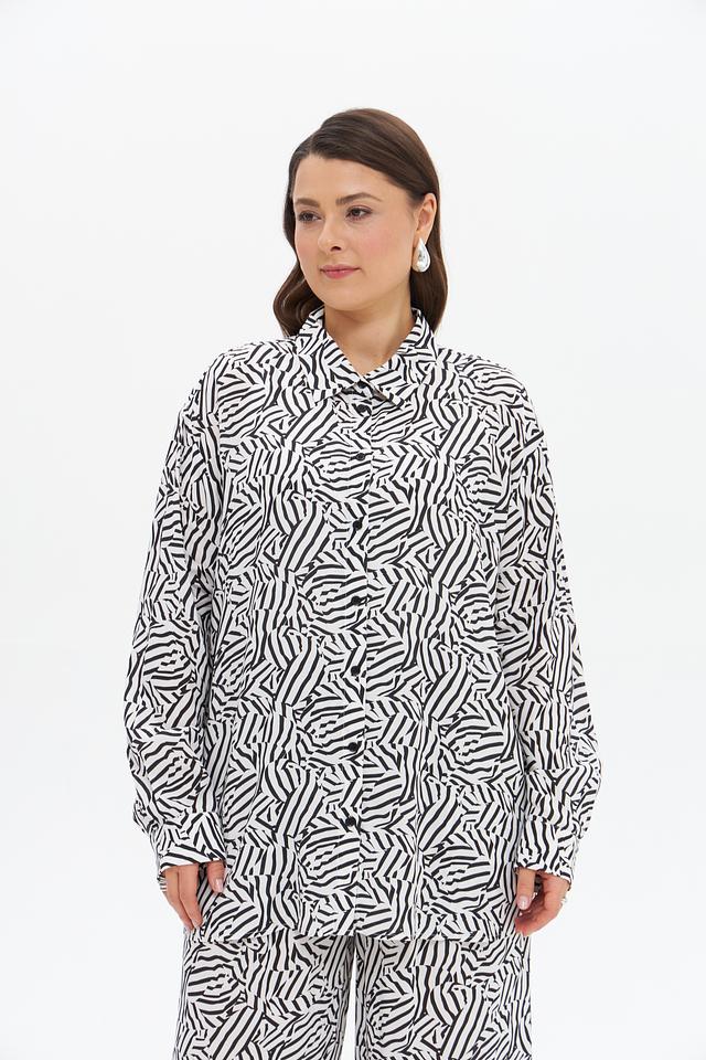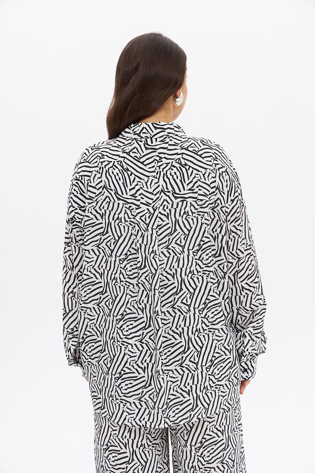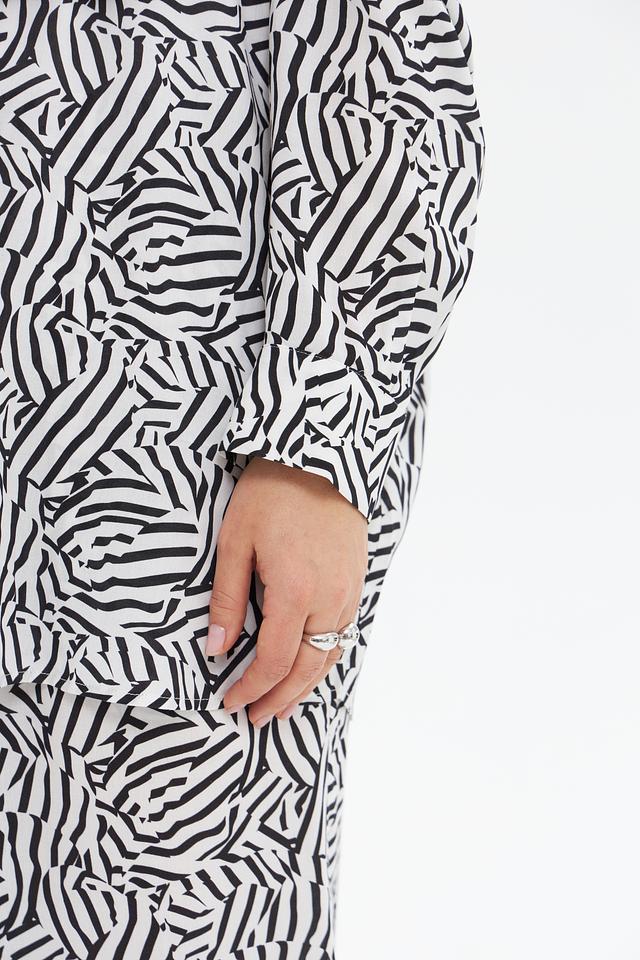 Эта блуза от UNQ – отличный выбор для создания модного и запоминающегося образа. Выполнена в контрастном чёрно-белом цвете с геометрическим принтом, имитирующим шкуру зебры.