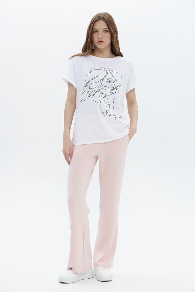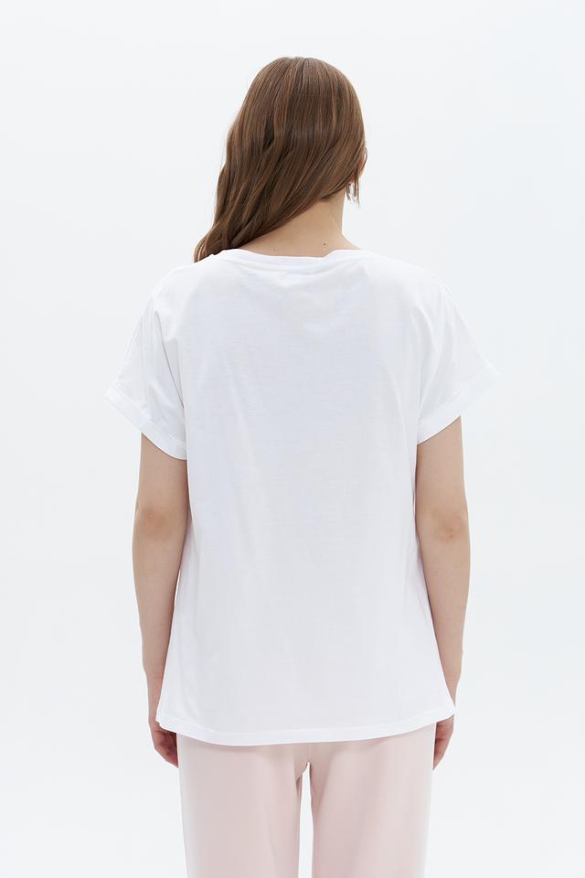 Футболка имеет прямой крой, короткие рукава с небольшим подворотом и круглый вырез горловины. Она идеально подходит для создания повседневных образов в сочетании с джинсами, брюками или юбками.