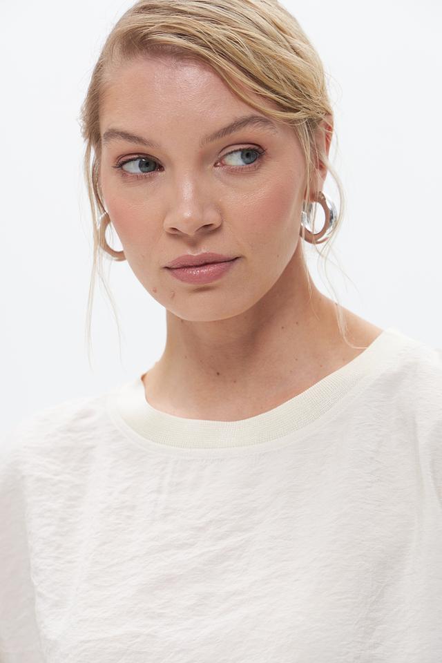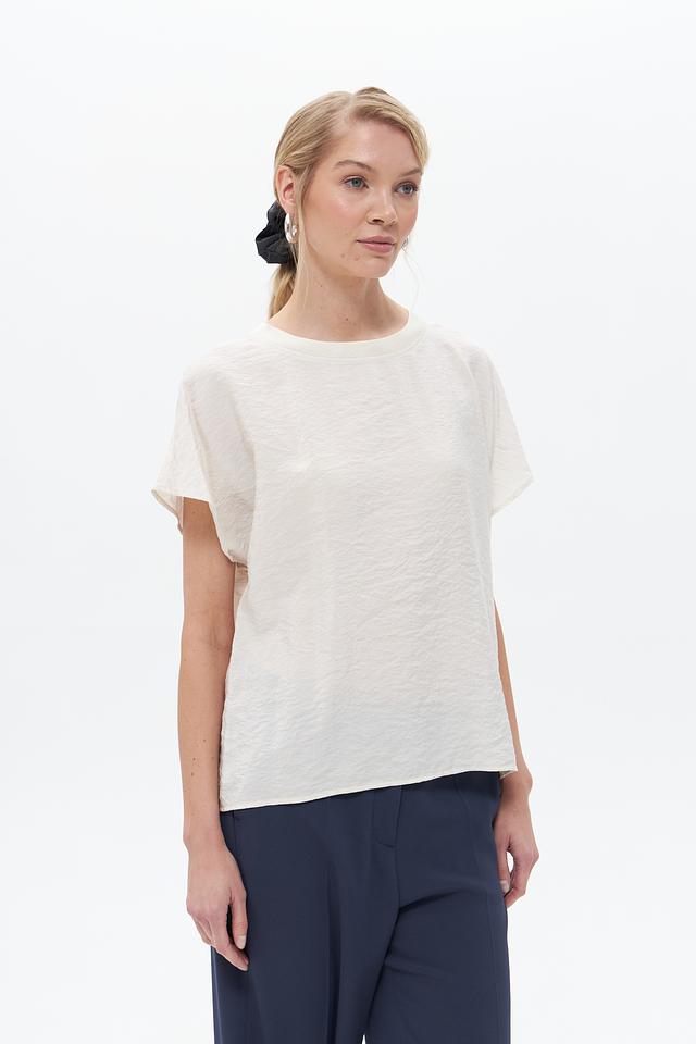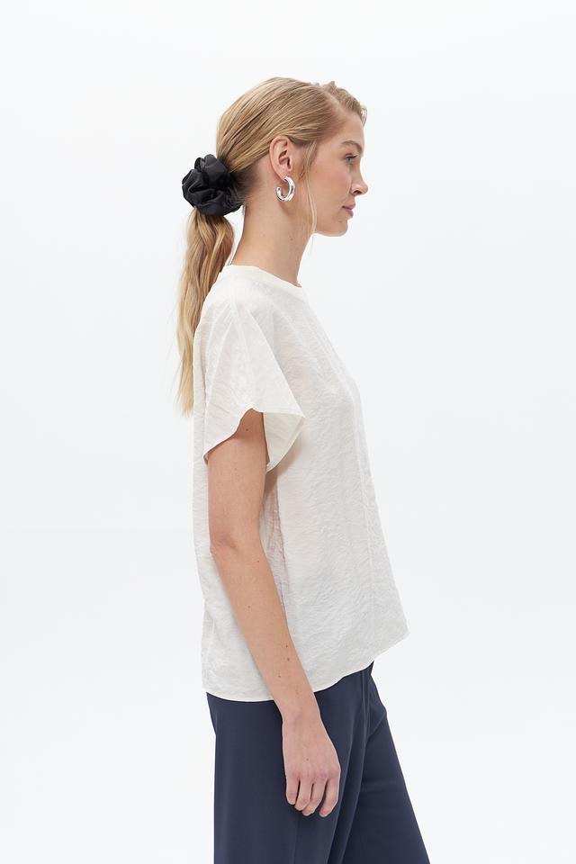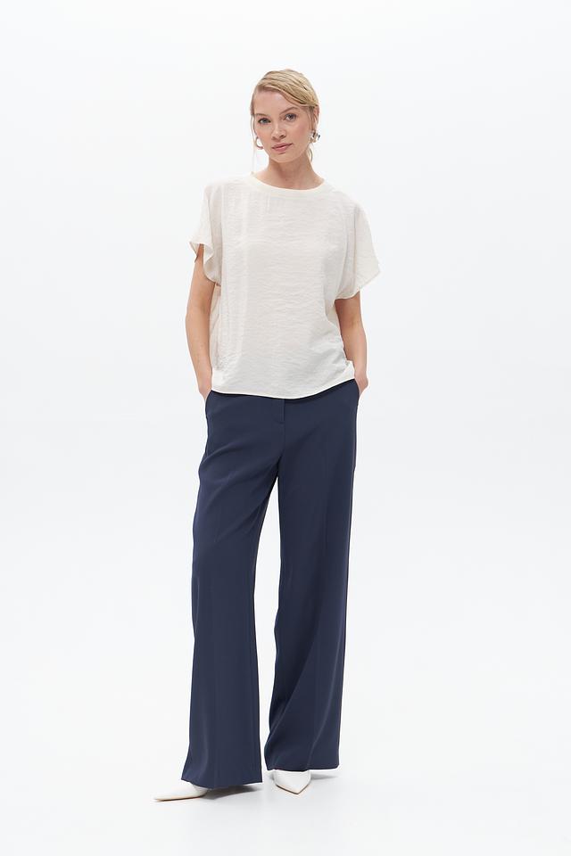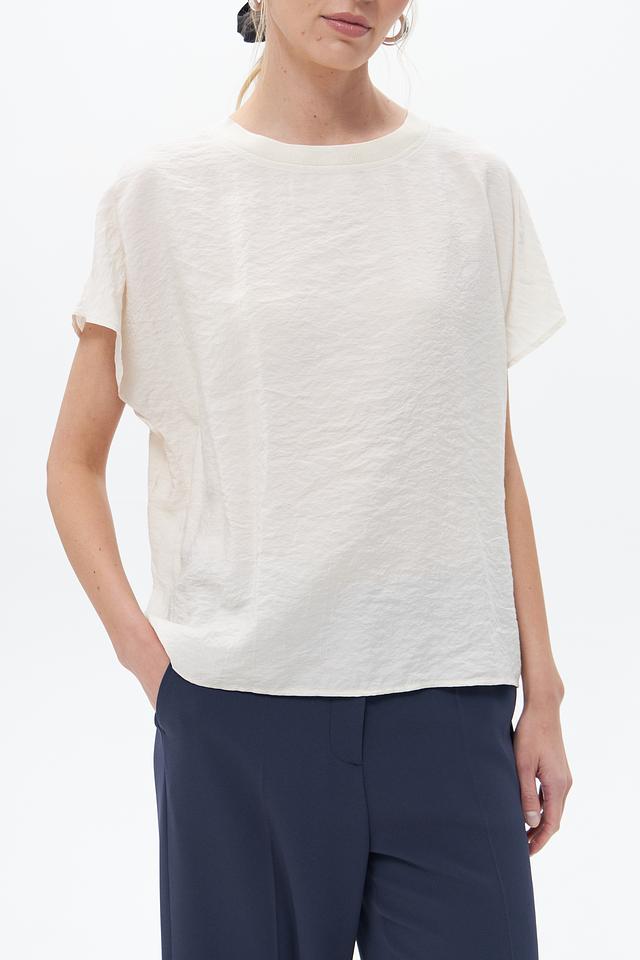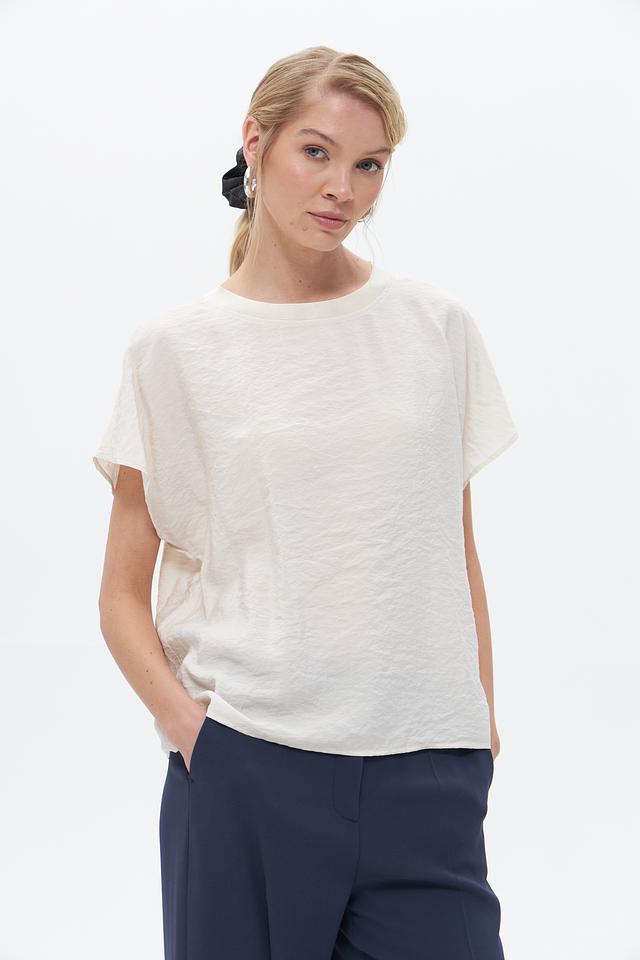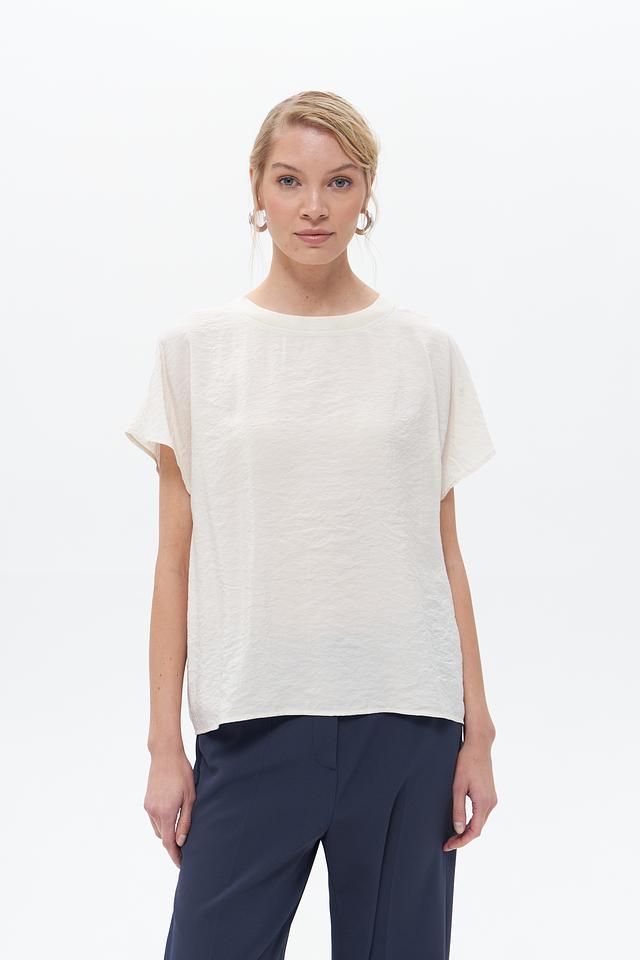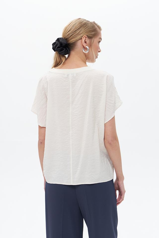 Модель имеет свободный крой, который обеспечивает комфорт в носке. Короткие рукава делают блузу идеальным выбором для теплой погоды. Округлый вырез горловины придает образу женственность.