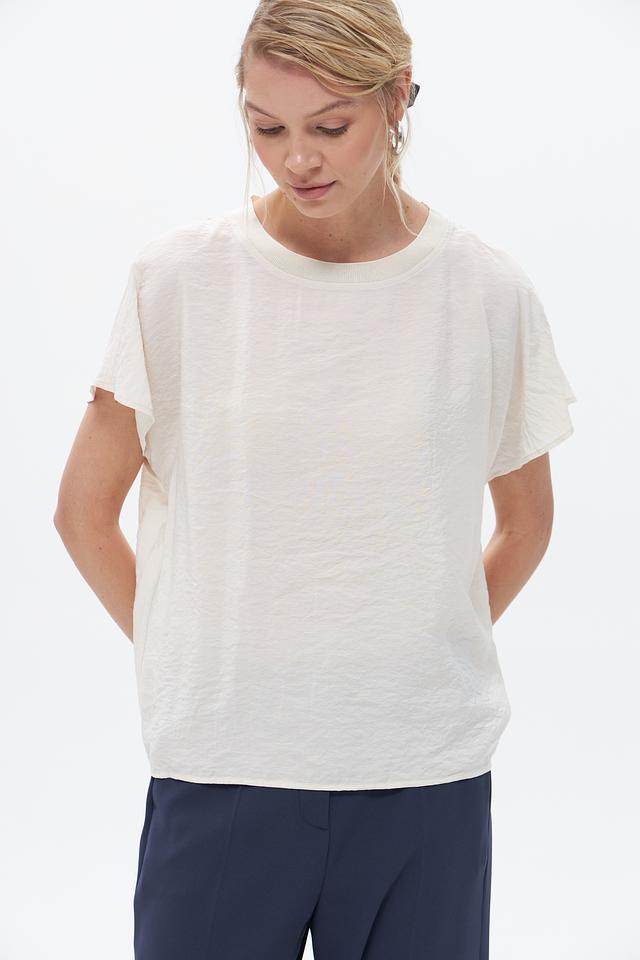 Бежевая блуза от UNQ из вискозы и полиэстера. Модель с коротким рукавом и округлым вырезом горловины. Легкая и комфортная в носке. Состав: вискоза 85%, полиэстер 15%
