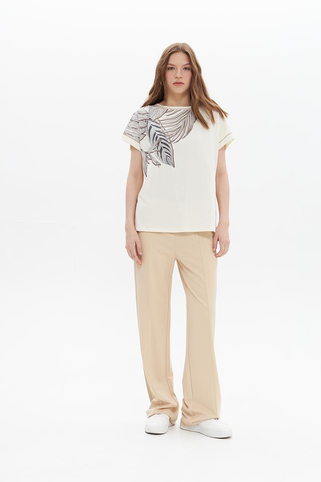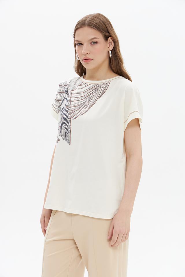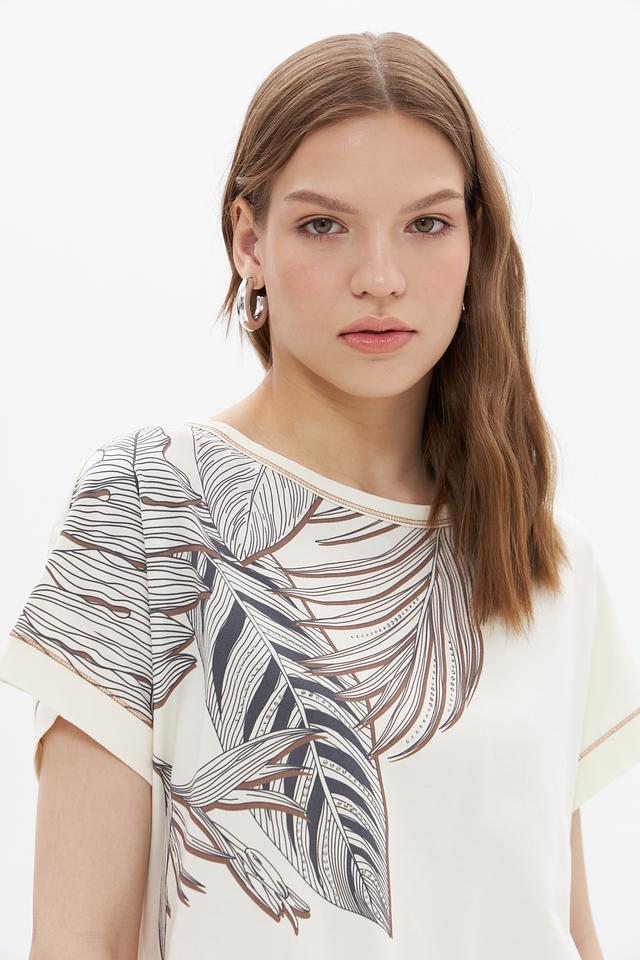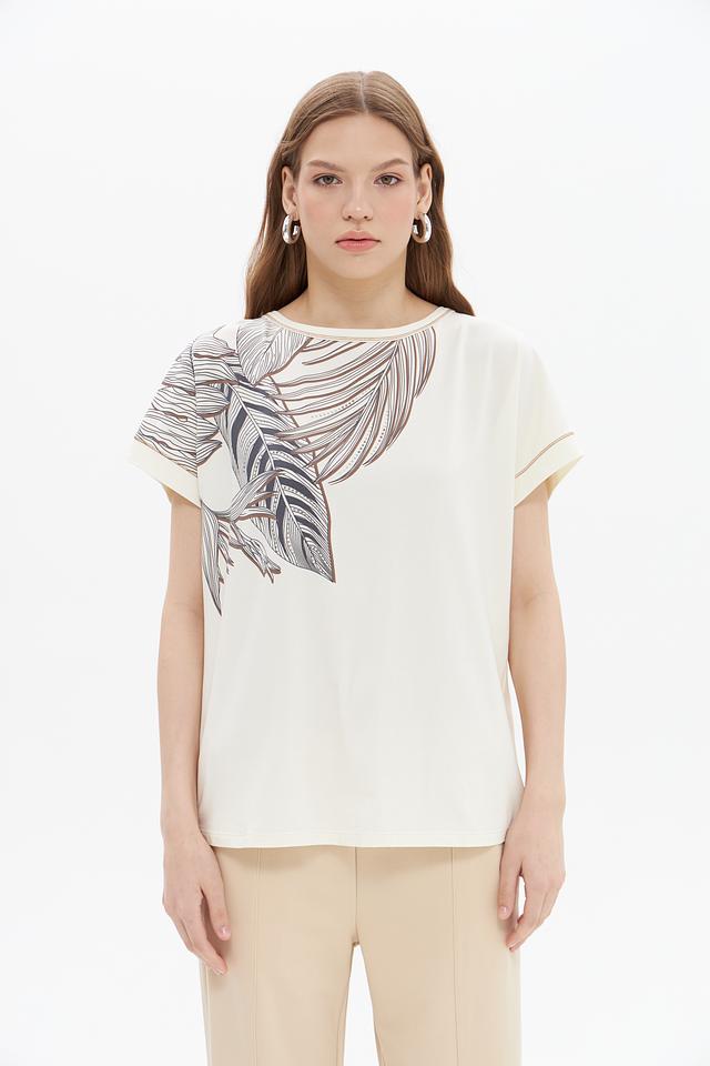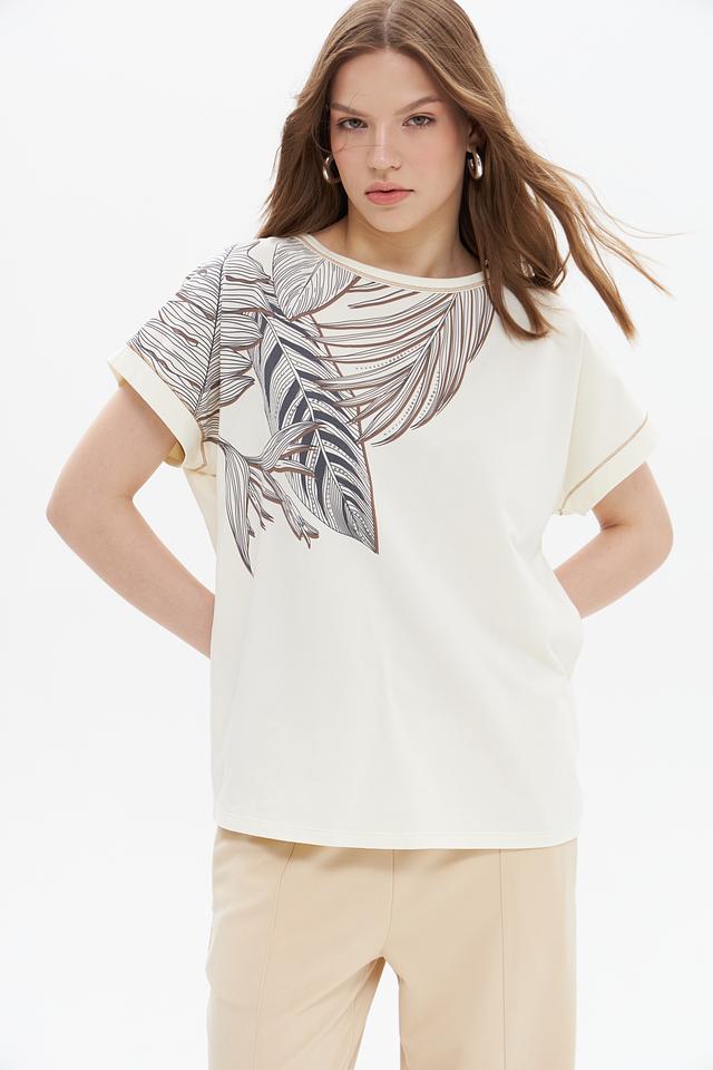 Женская футболка UNQ кремового цвета с оригинальным принтом в виде листьев. Изготовлена из мягкого хлопка с добавлением эластана для комфорта и лучшей посадки. Состав: хлопок 92%, эластан 8%