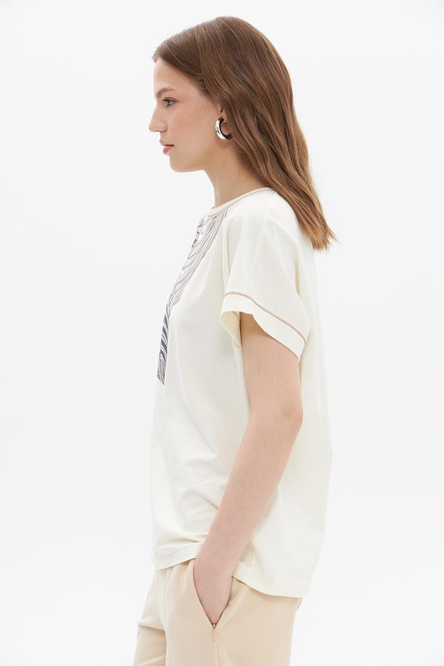 Кремовый цвет футболки легко сочетается с различными элементами одежды, позволяя создавать разнообразные образы – от повседневных до более нарядных. Эта футболка идеально подойдет для прогулок, встреч с друзьями или работы.