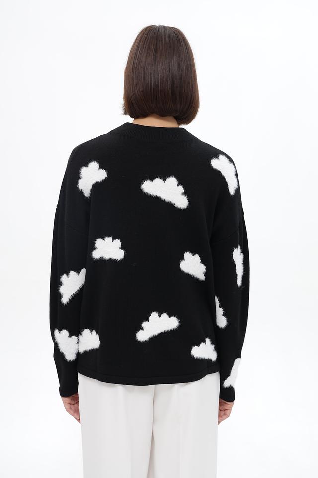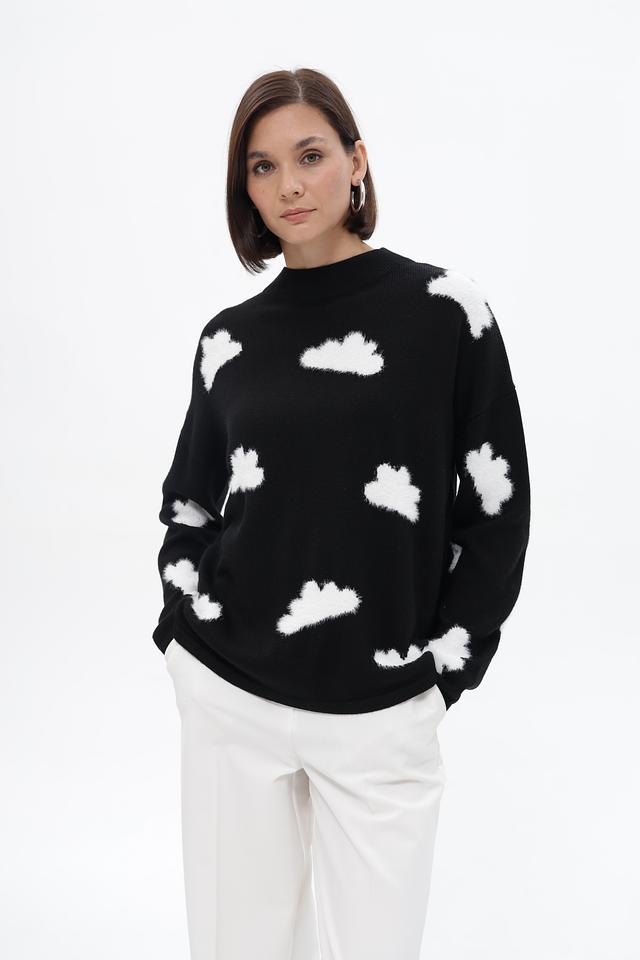 Чёрный пуловер от UNQ с оригинальным принтом в виде белых облаков. Изготовлен из мягкой смеси шерсти, полиакрила и полиамида, обеспечивающей комфорт и тепло. Идеально подходит для создания уютных и стильных образов. Состав: шерсть 44%, полиакрил 44%, полиамид 12%
