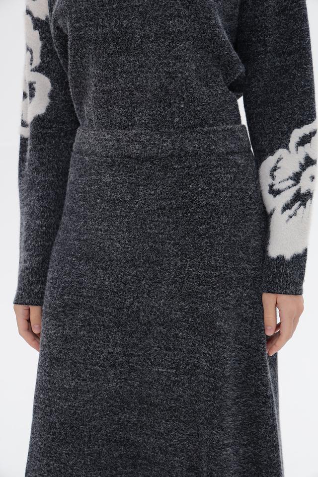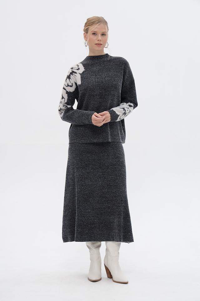 Представляем вязаную юбку от бренда UNQ. Модель выполнена в сером цвете с акцентным цветочным узором на рукавах. Юбка имеет длину миди и облегающий силуэт, подчеркивающий фигуру.