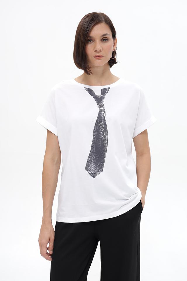 Особенностью данной футболки является оригинальный принт в виде галстука, который добавляет образу нотку индивидуальности и стиля. Футболка имеет круглый вырез горловины, что делает ее универсальной для различных типов фигуры.