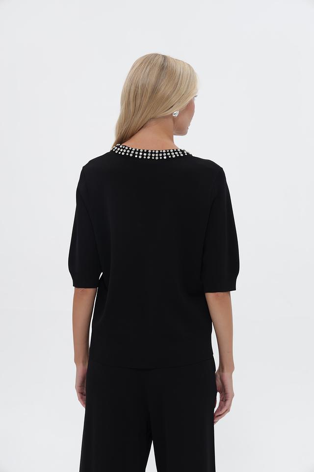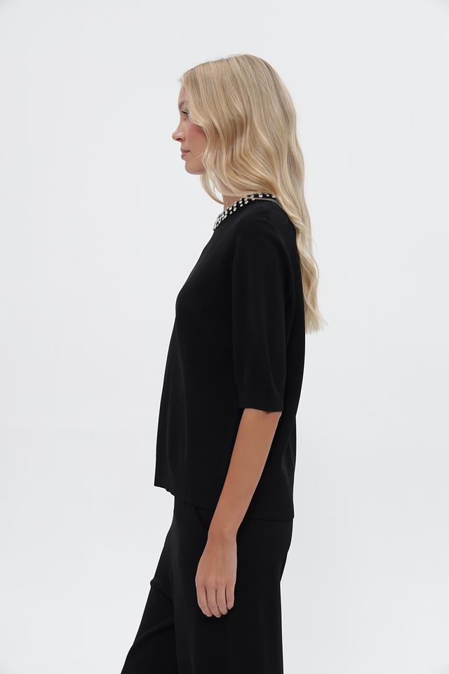 Пуловер имеет прямой крой и короткий рукав, что обеспечивает комфорт и свободу движений. Особый акцент в этом изделии – изящный декор из мелких бусин, украшающий горловину. Он придаёт изделию элегантность и изысканность.