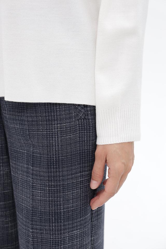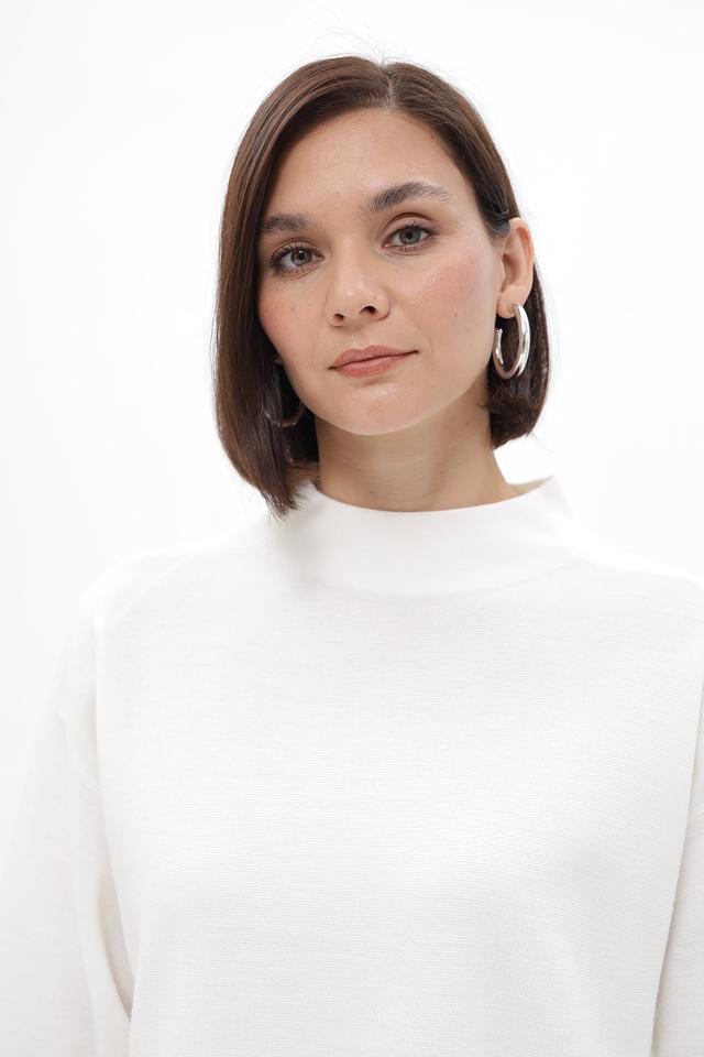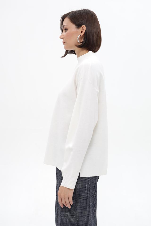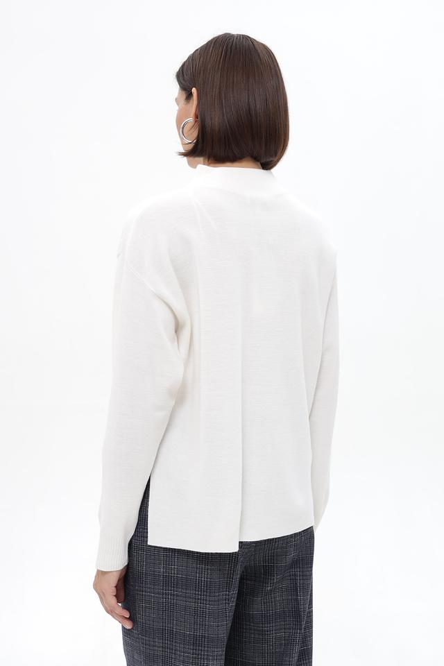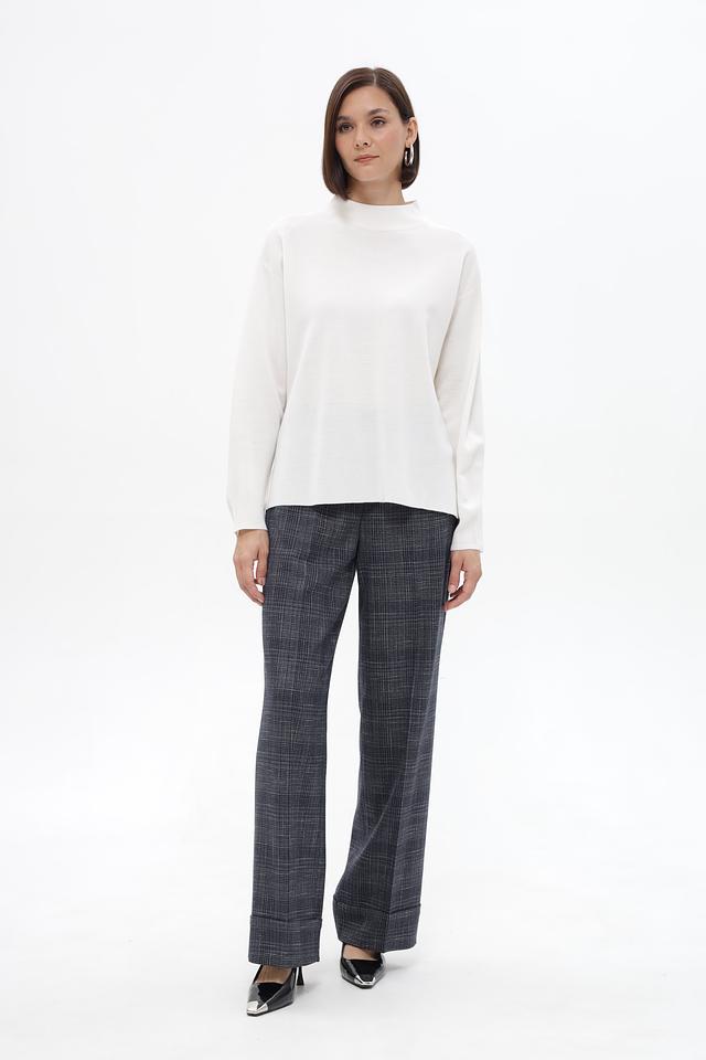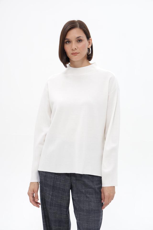 Пуловер имеет прямой, слегка свободный крой, который обеспечивает комфортную посадку по фигуре. Высокий ворот-стойка добавляет образу элегантности и позволяет создавать разнообразные стилистические решения.