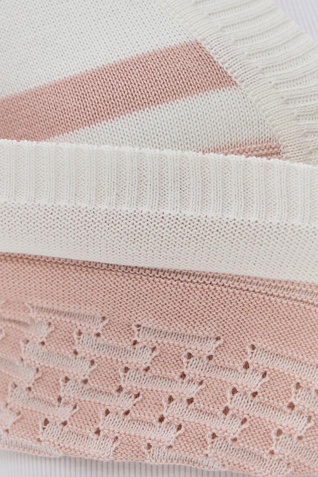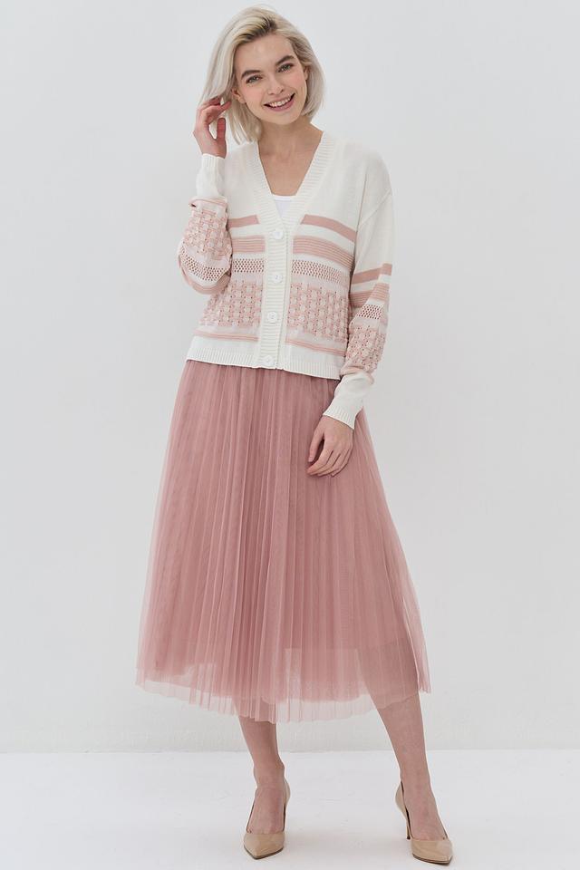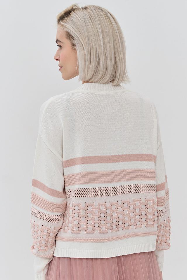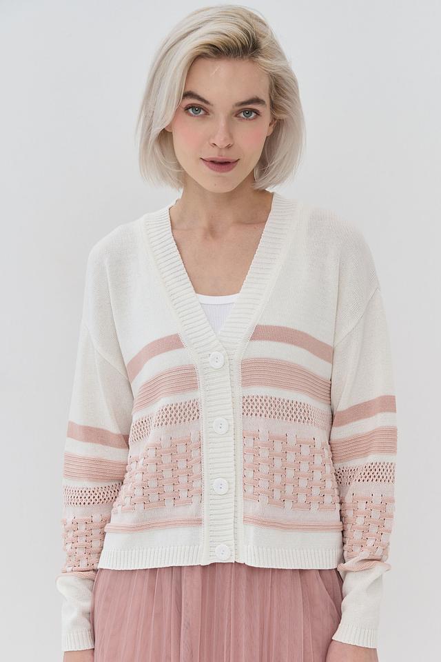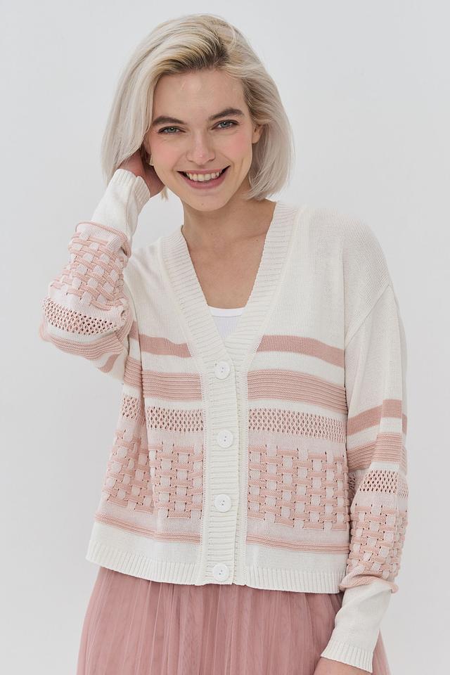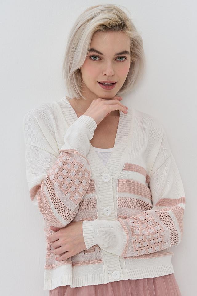 Кардиган имеет классический V-образный вырез и застегивается на ряд пуговиц. Его отличает оригинальный дизайн: сочетание кремового и нежно-розового цветов, а также текстурный узор "косичка" на рукавах.