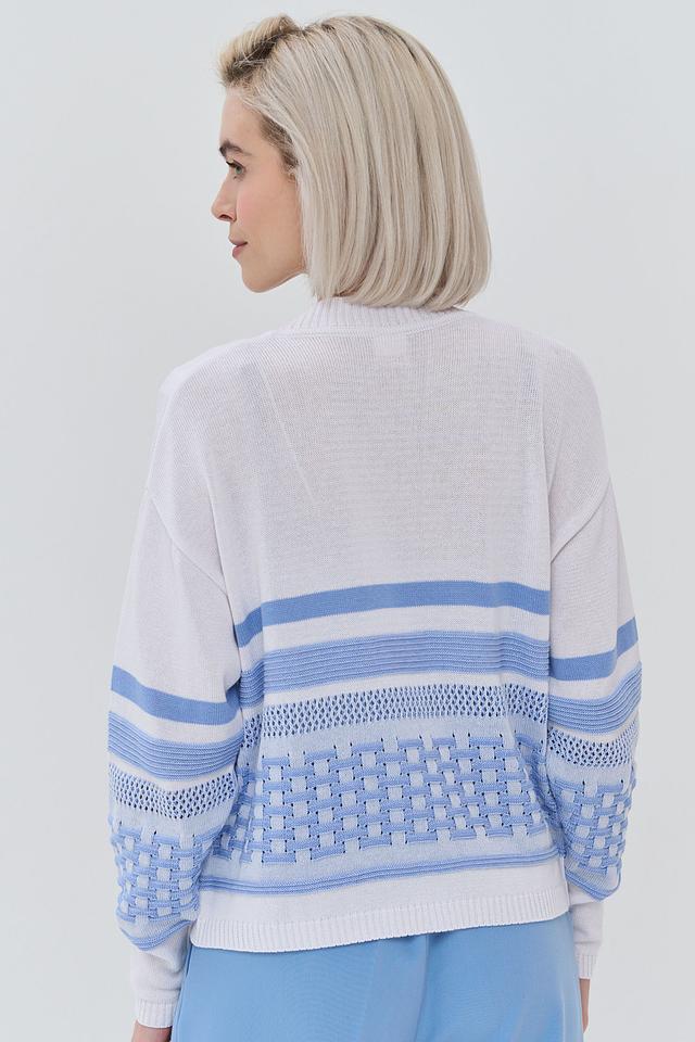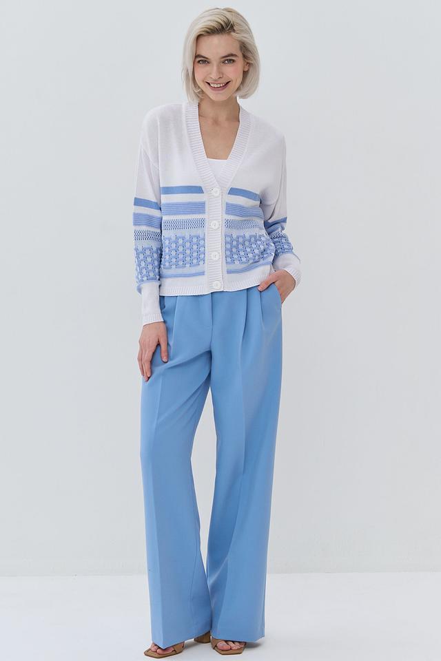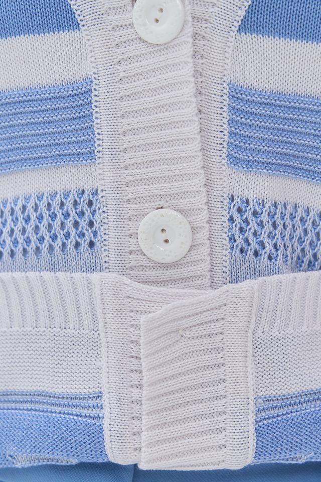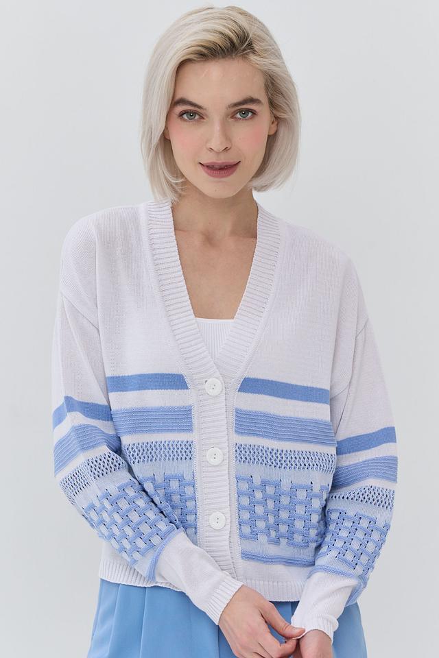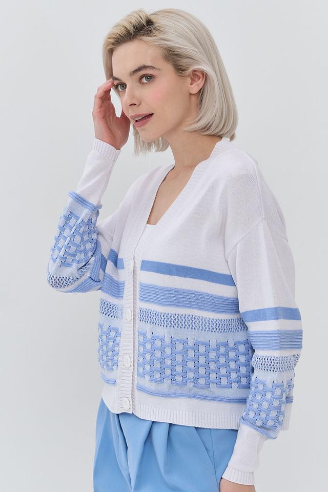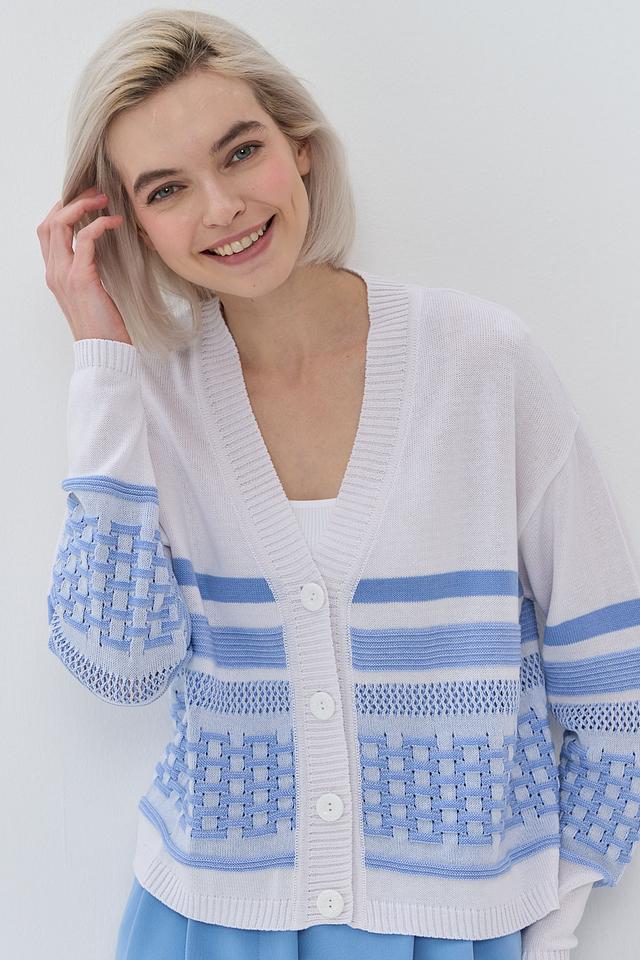 Кардиган имеет прямой крой и V-образный вырез. Дизайн украшен горизонтальными полосками голубого и белого цветов, а также геометрическим узором в виде ромбов на рукавах и нижней части изделия. Застежка на пуговицы позволяет регулировать степень открытости и создавать различные силуэты.