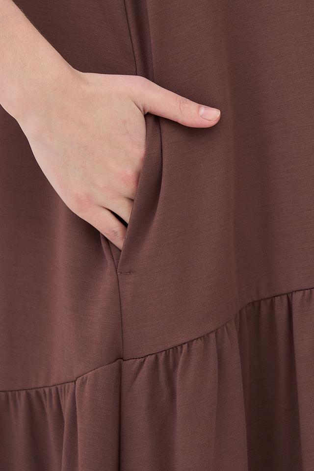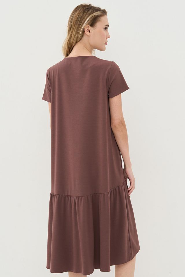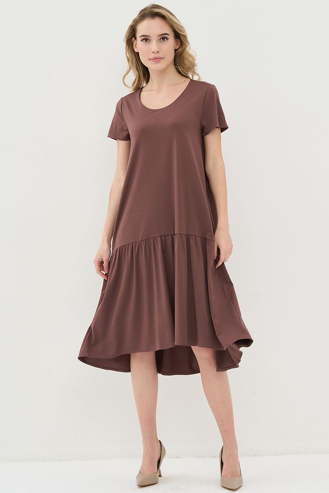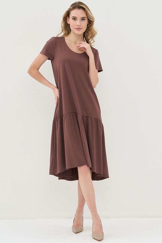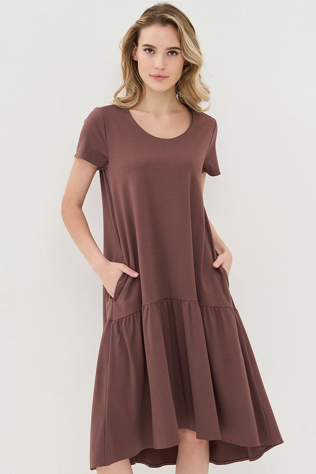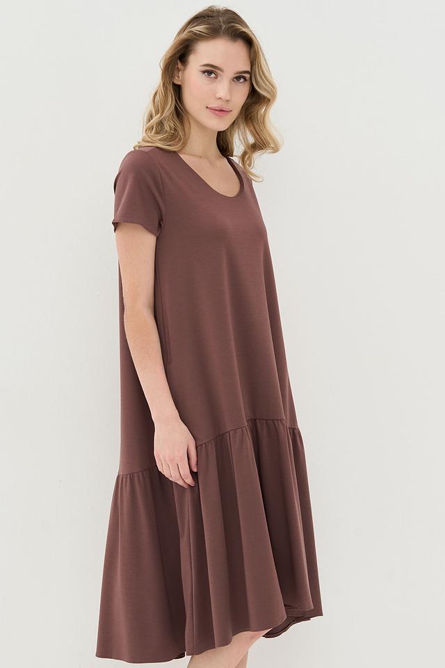 Коричневое платье от VAY свободного кроя с юбкой-солнце и короткими рукавами. Модель выполнена из мягкой вискозы с добавлением нейлона и спандекса, что обеспечивает комфорт и хорошую посадку по фигуре. Состав: вискоза 55%, нейлон 40%, спандекс 5%