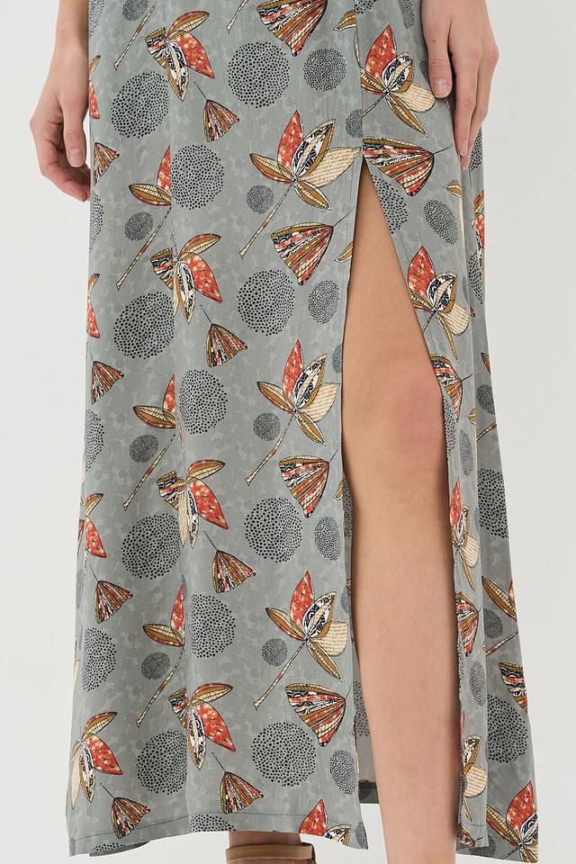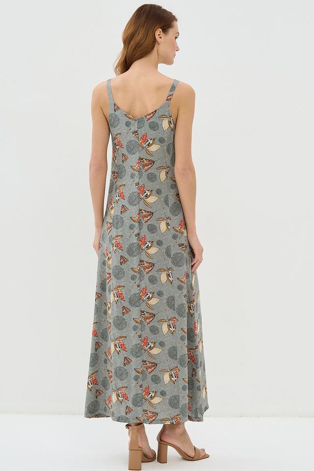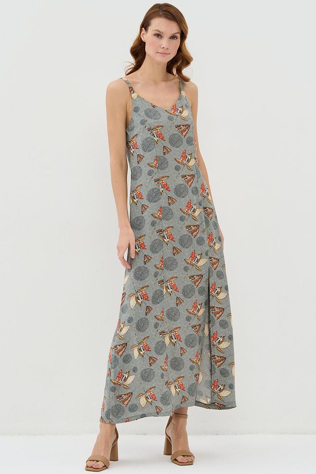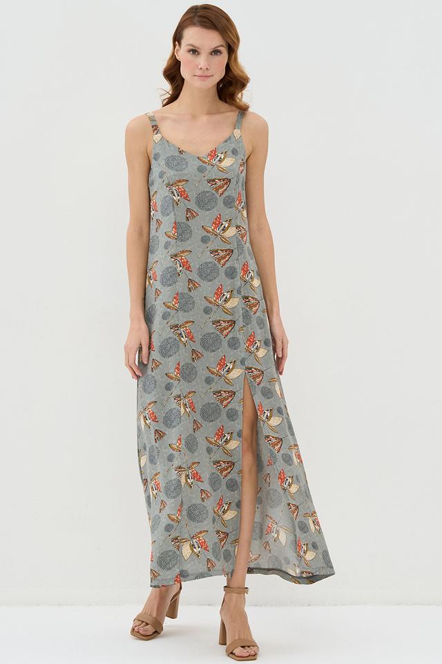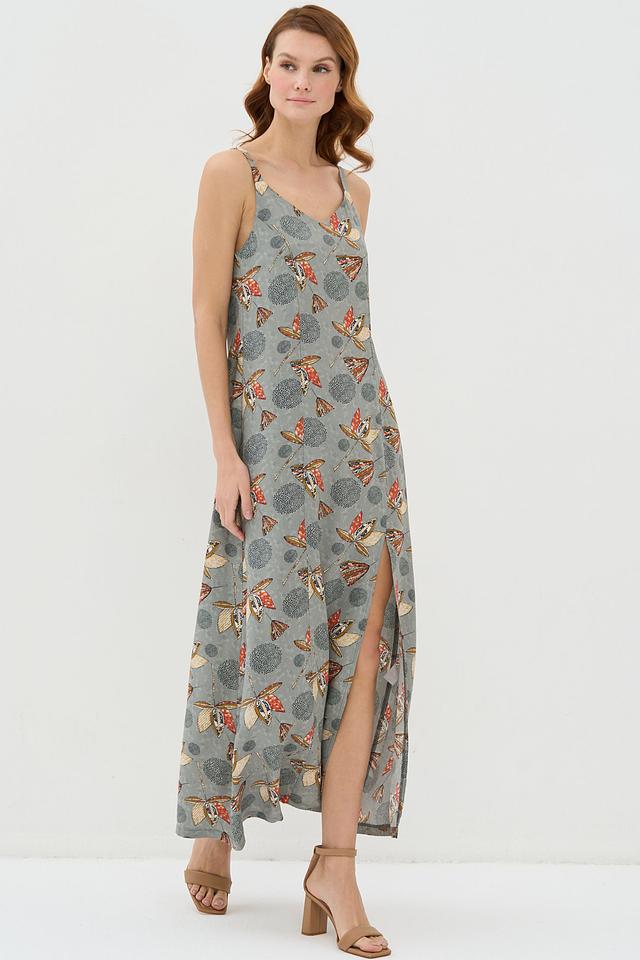 Особенностью этого платья является яркий принт с изображением бабочек и цветов на сером фоне. Боковой разрез добавляет платью динамичности и легкости.