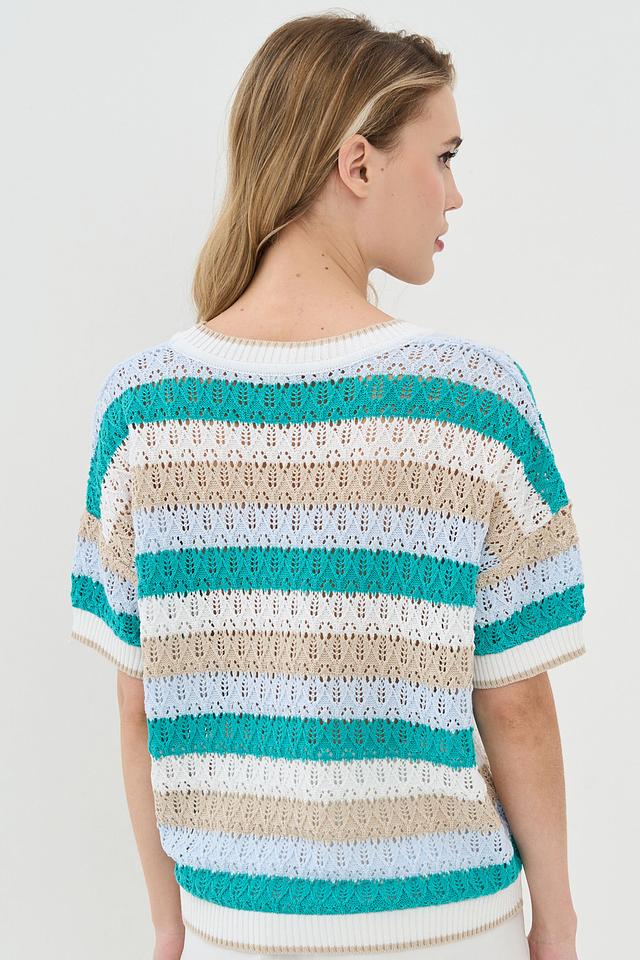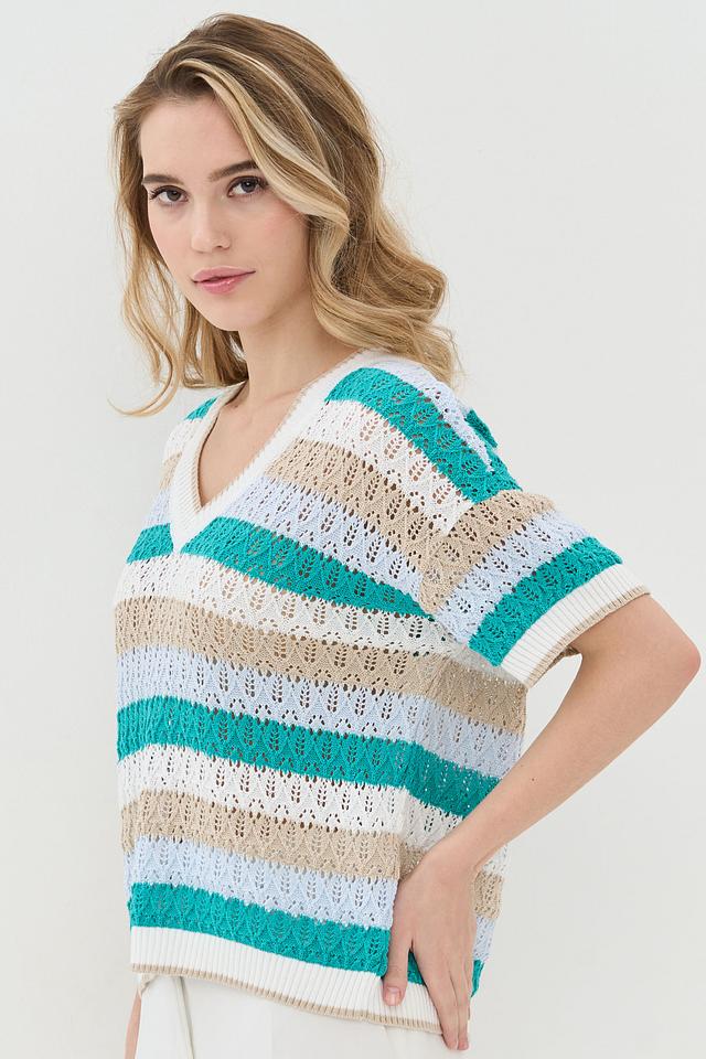 Женский джемпер VAY голубого цвета с короткими рукавами выполнен в полосатом дизайне. Модель имеет V-образный вырез и лёгкую, ажурную вязку, идеально подходит для создания летних образов. Состав: хлопок 50%, пан 50%