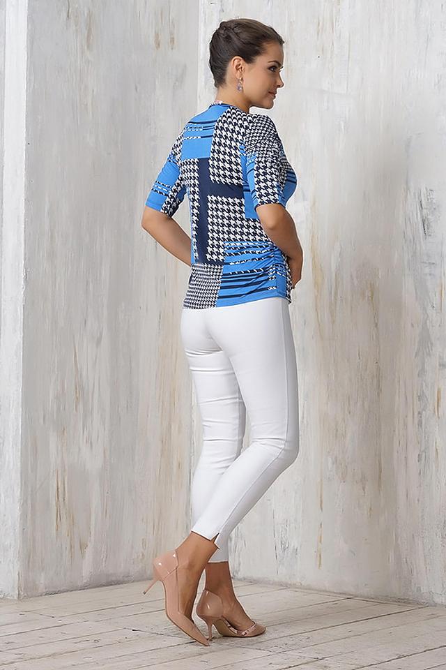 Блуза выполнена из высококачественной микрофибры (95%) с добавлением эластана (5%), что обеспечивает приятные тактильные ощущения и хорошую посадку по фигуре. Принт состоит из сочетания классической клетчатой расцветки и полосок, выполненных в синих и белых тонах.