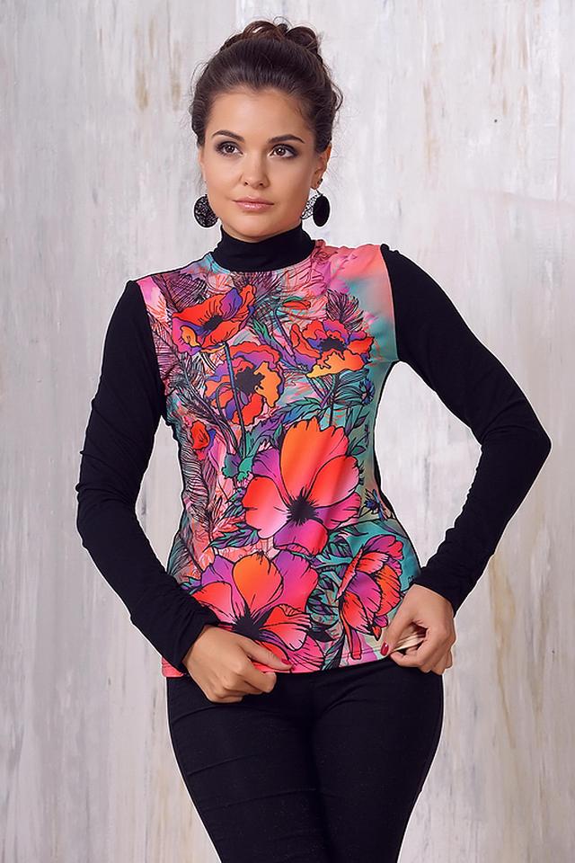 Блуза VAY черного и розового цвета с ярким цветочным принтом. Модель выполнена из мягкой вискозы с добавлением эластана, что обеспечивает комфорт и хорошую посадку по фигуре. Состав: вискоза 95%, эластан 5%