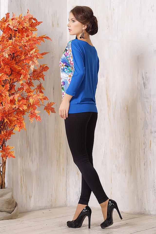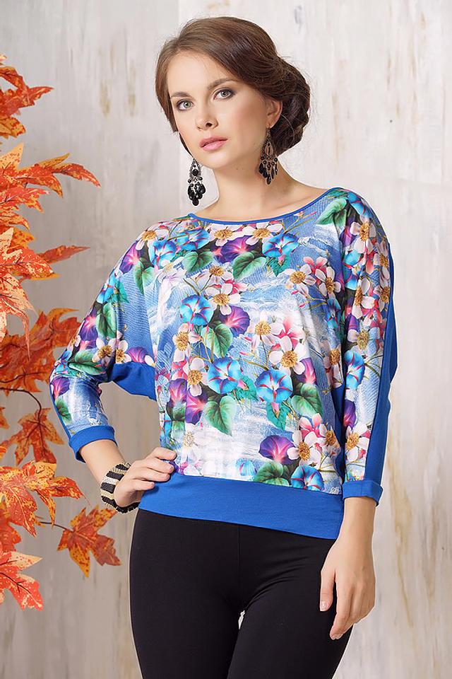 Женская блуза VAY синего цвета с ярким цветочным принтом. Модель выполнена из мягкой вискозы с добавлением эластана, что обеспечивает комфорт и удобство в носке. Блуза имеет оригинальный крой с рукавами 3/4. Состав: вискоза 95%, эластан 5%