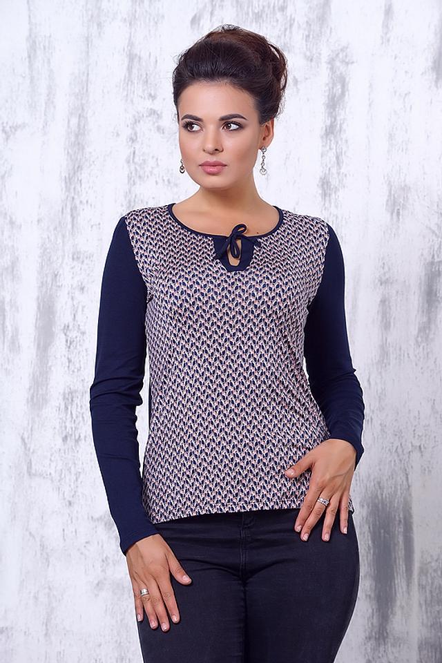 Стильная блуза VAY темно-синего и белого цвета с оригинальным принтом и декоративным вырезом на горловине. Изготовлена из мягкой вискозы с добавлением эластана для комфорта и хорошей посадки. Состав: вискоза 95%, эластан 5%