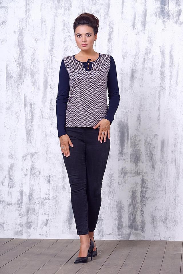 Эта элегантная блуза от VAY станет прекрасным дополнением к вашему гардеробу. Блуза выполнена в сочетании темно-синего и белого цветов, с интересным геометрическим принтом, который придает ей особый шарм.