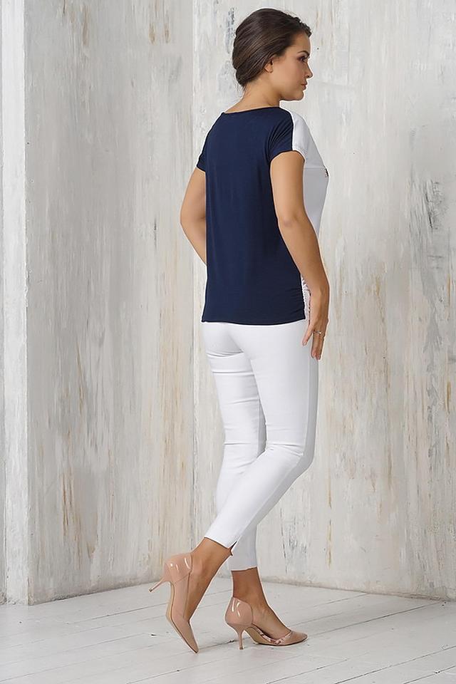 Модель имеет короткие рукава и округлый вырез горловины. Декоративная отделка в виде темной полосы вдоль выреза и на рукавах добавляет блузе изысканности. Блуза выполнена из приятной к телу вискозы (95%) с добавлением эластана (5%), что обеспечивает комфортную посадку и легкий уход.