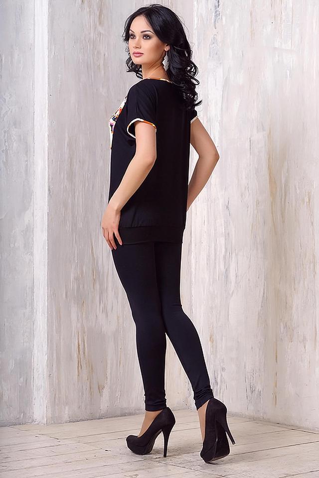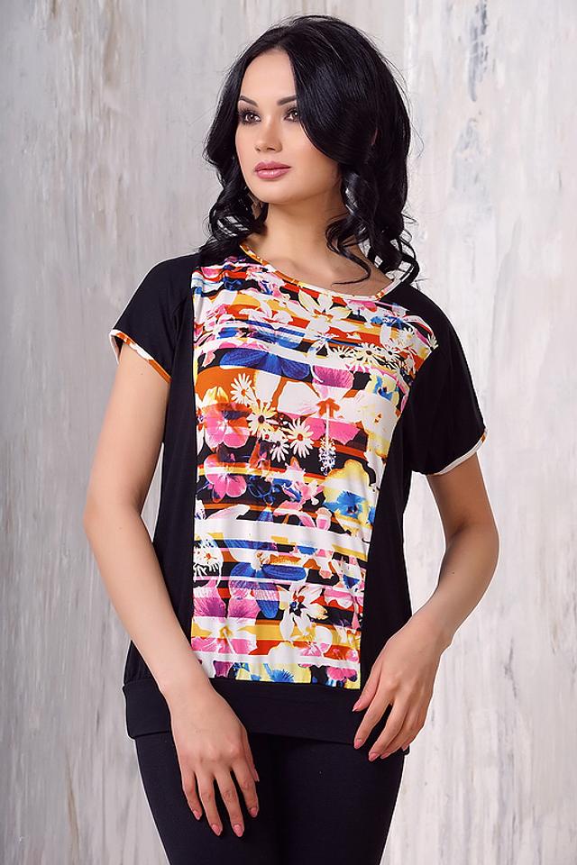 Основной цвет блузы – чёрный, что делает её универсальной и легко сочетаемой с другими предметами одежды. Верхняя часть блузы украшена ярким цветочным принтом, выполненным в разнообразных оттенках: жёлтом, оранжевом, розовом, белом и других.